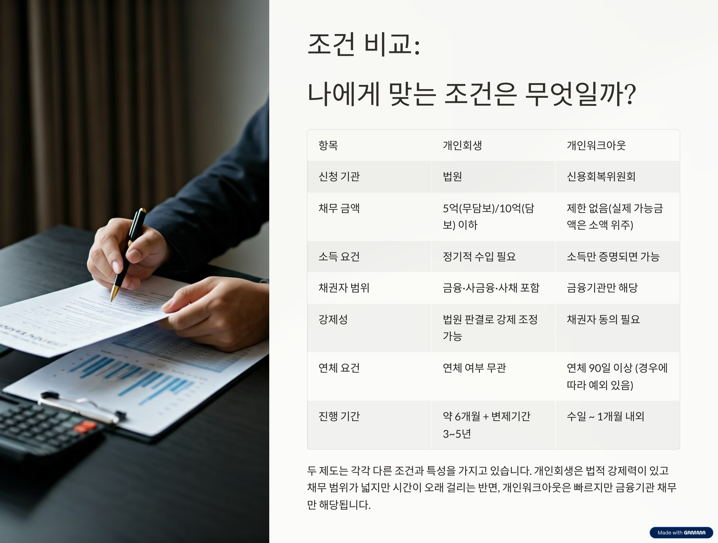 오늘은 많은 분들이 궁금해하시는 개인회생 비용 개인워크아웃 조건 비교를 핵심만 뽑아 정리해 보겠습니다.
