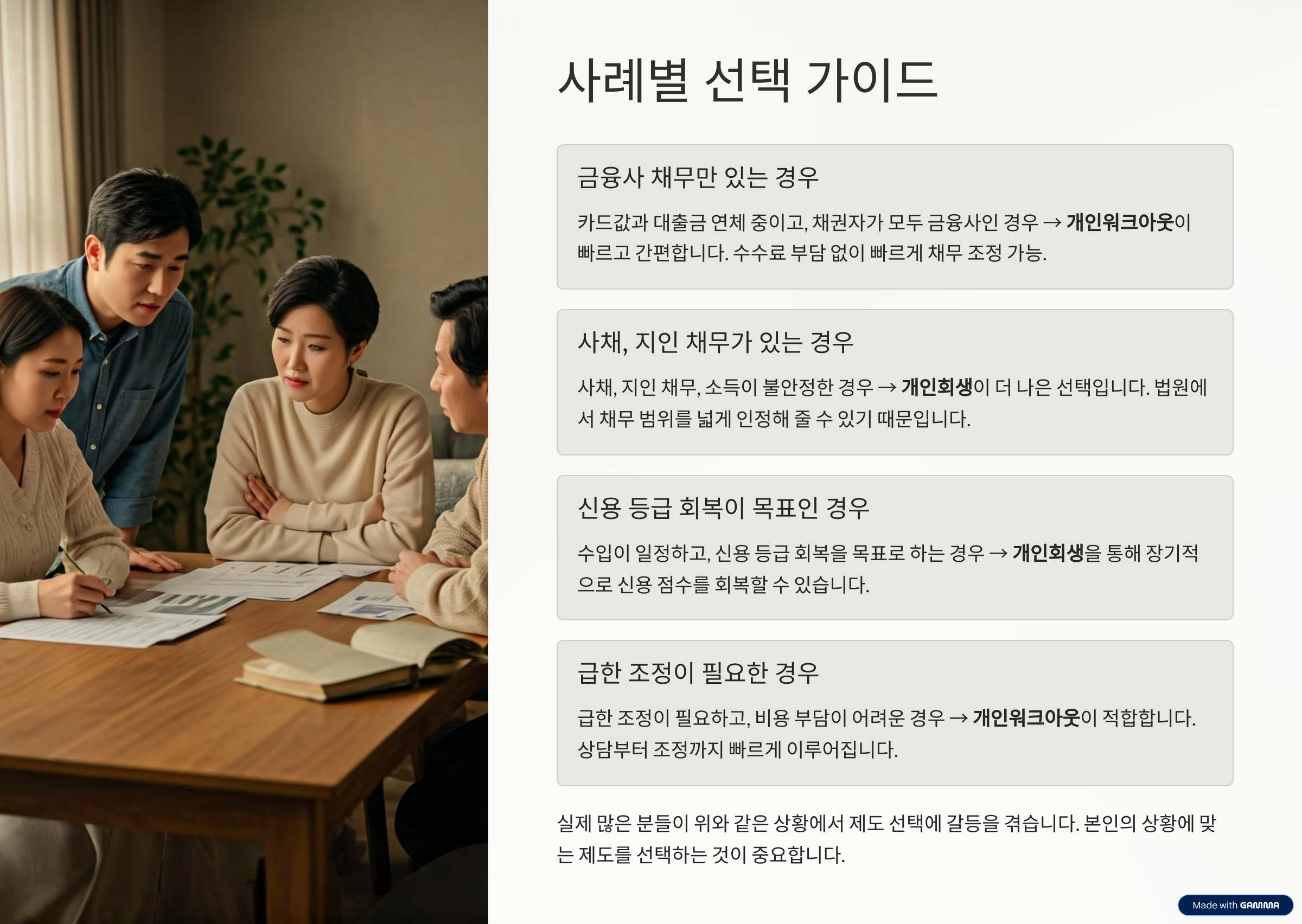 → 개인워크아웃이 적합합니다. 상담부터 조정까지 빠르게 이루어지며 무료 지원도 받을 수 있습니다.