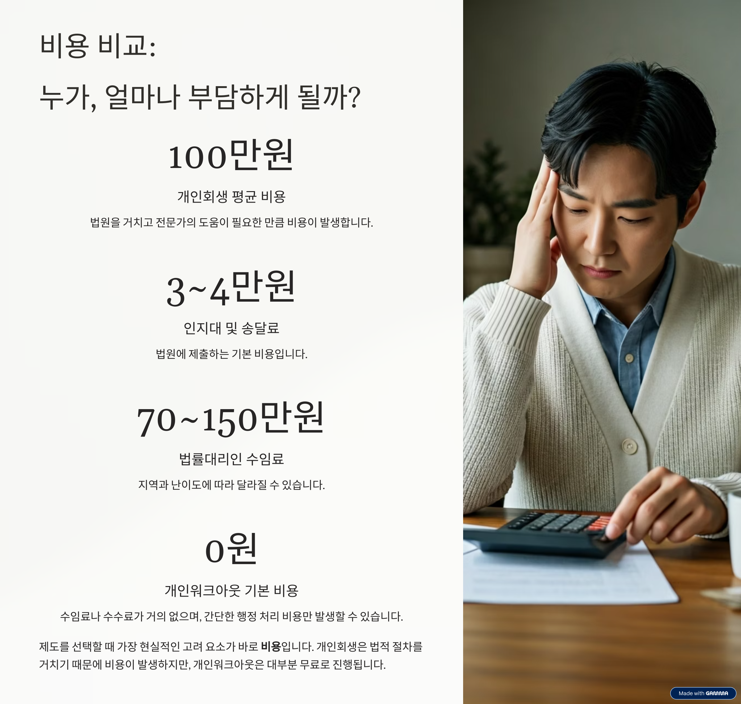 반면 개인워크아웃은 수임료나 수수료가 거의 없습니다. 단, 상황에 따라 간단한 행정 처리 비용(우편 발송, 인쇄 등) 정도는 발생할 수 있으나, 대부분 자비로 할 수 있는 수준입니다.