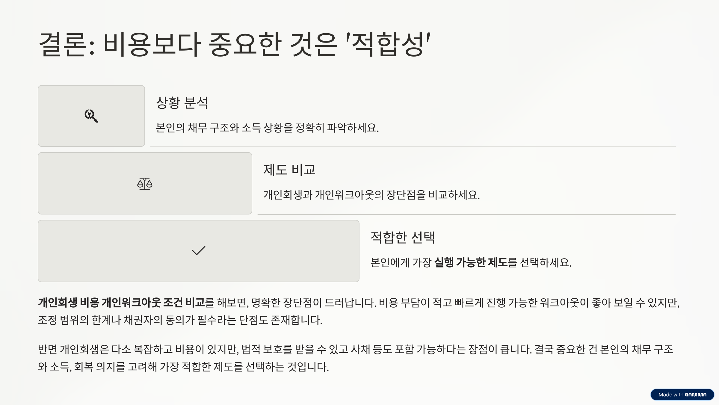 두 제도 모두 채무 부담을 줄이고 일정 기간 동안 변제 계획을 수행함으로써 신용을 회복하고 새 출발을 돕는 구조입니다. 하지만 각각의 조건과 절차, 비용은 매우 다르기 때문에 막연하게 판단하기보다는 본인의 상황에 맞춰 꼼꼼히 따져보는 것이 중요합니다.