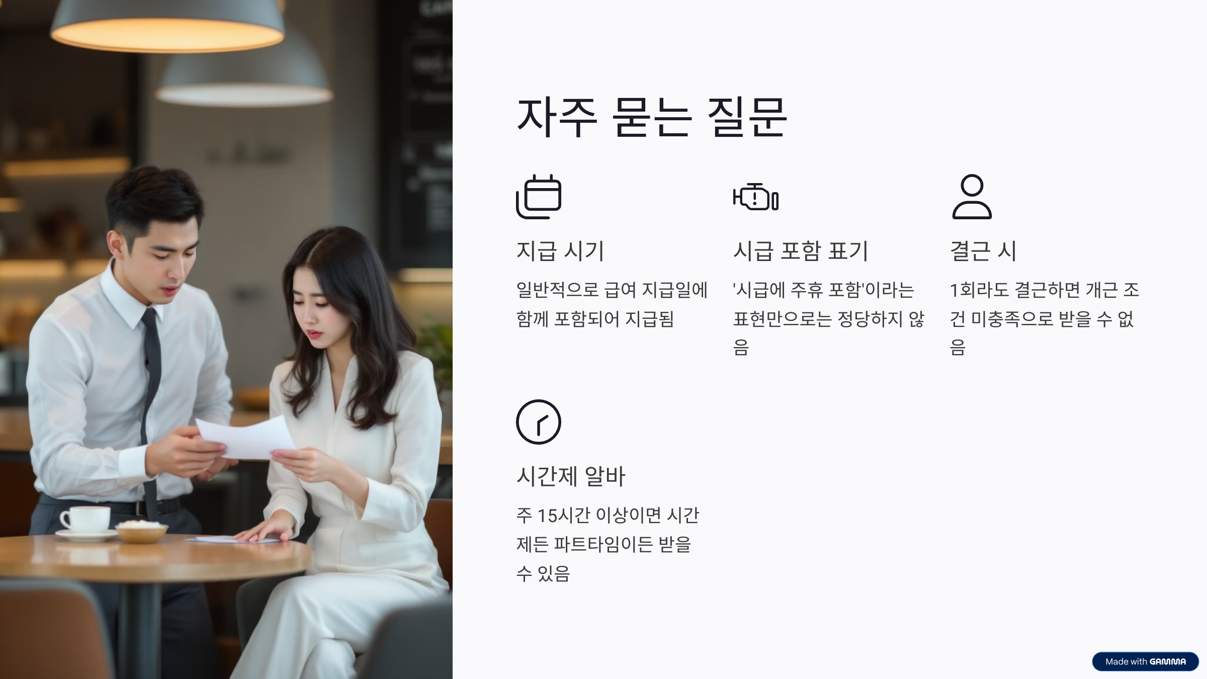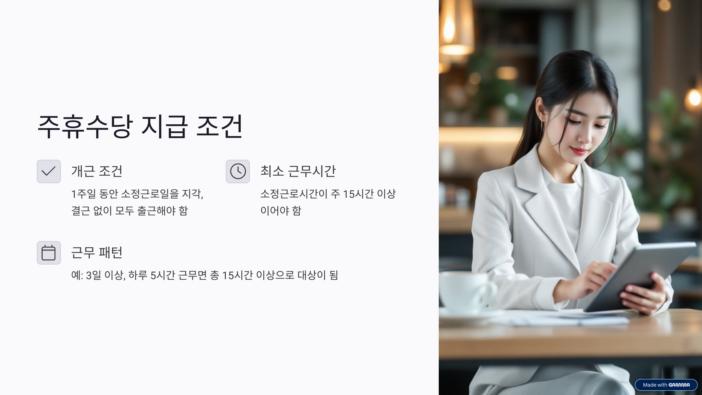 → ‘1주일 근무 후 다음 주에 발생’하는 개념이기 때문에, 첫 주에는 해당되지 않는 경우가 많습니다. - 시간제 알바도 받을 수 있나요?