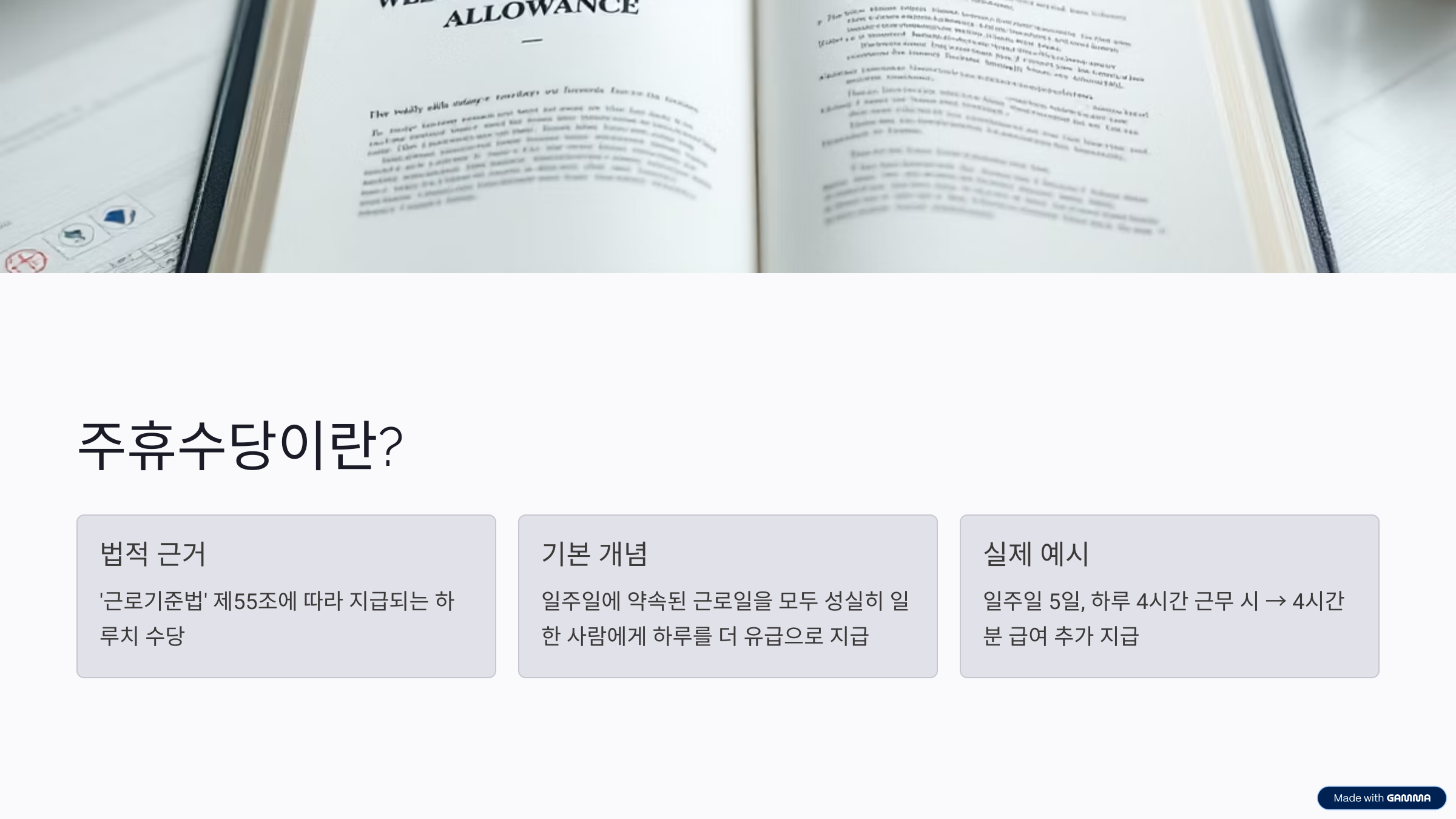 주휴수당은 ‘근로기준법’ 제55조에 따라 일정 조건을 충족한 근로자에게 유급으로 지급되는 하루치 수당을 말합니다. 쉽게 말해, 일주일에 약속된 근로일을 모두 성실히 일한 사람에게 ‘하루를 더 유급으로 쳐준다’는 개념이에요.