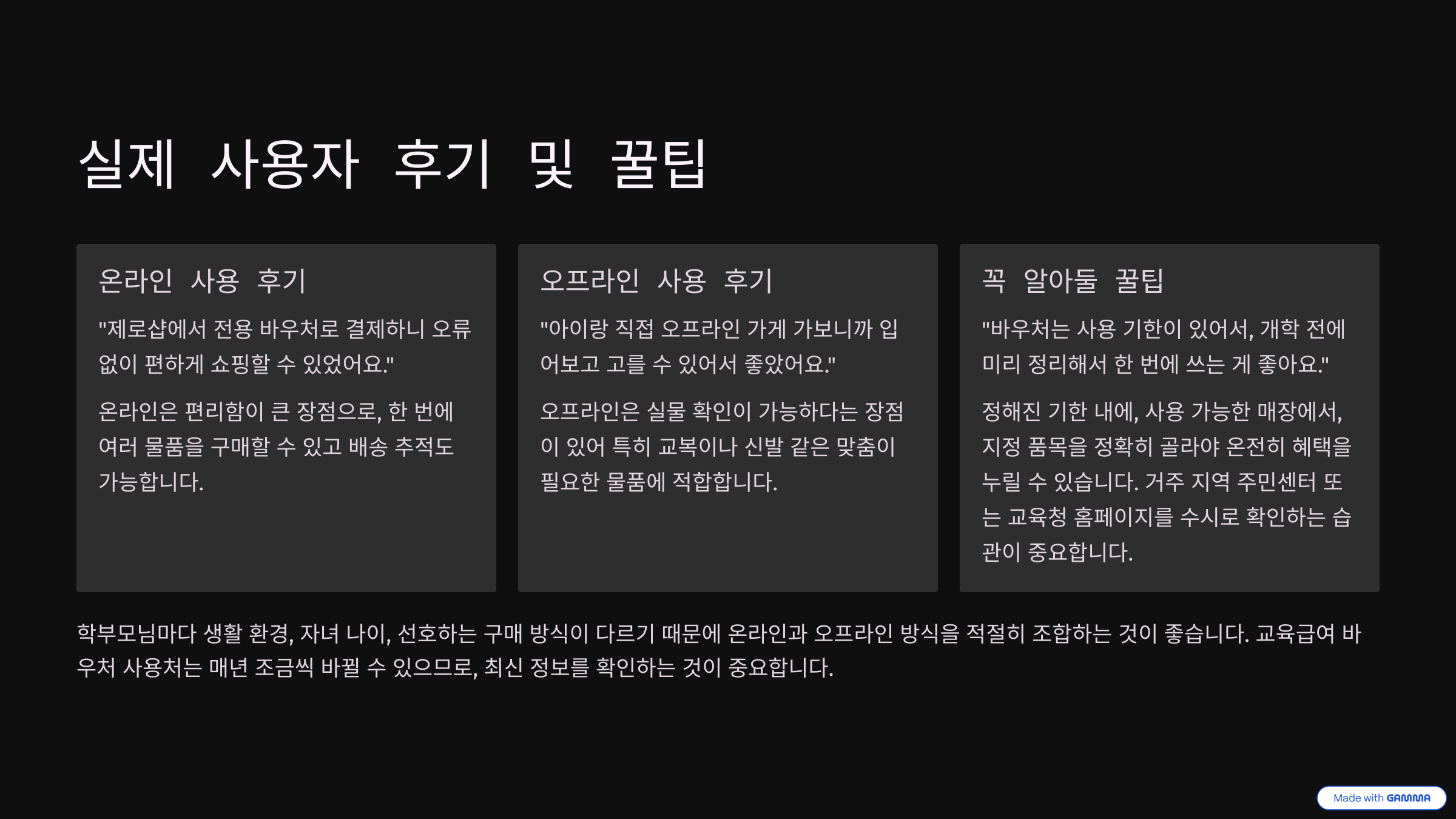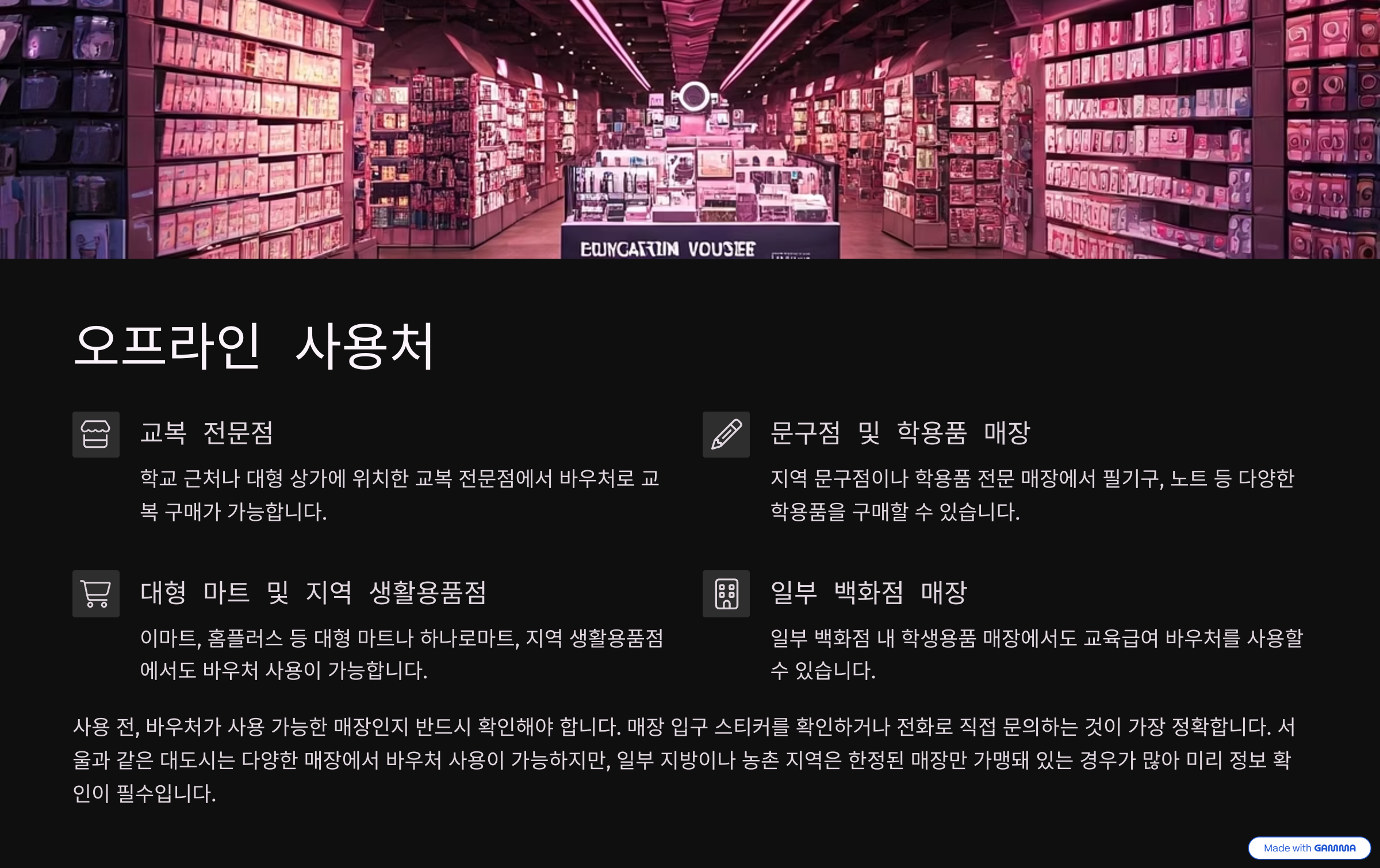 주의할 점은 모든 오프라인 매장이 모바일 바우처를 지원하지 않는다는 것입니다. 예를 들어 교복 전문점이나 소형 문구점에서는 실물 카드만 받아주는 경우도 있어, 사용 형태에 맞는 방식으로 수령하는 것이 좋습니다.