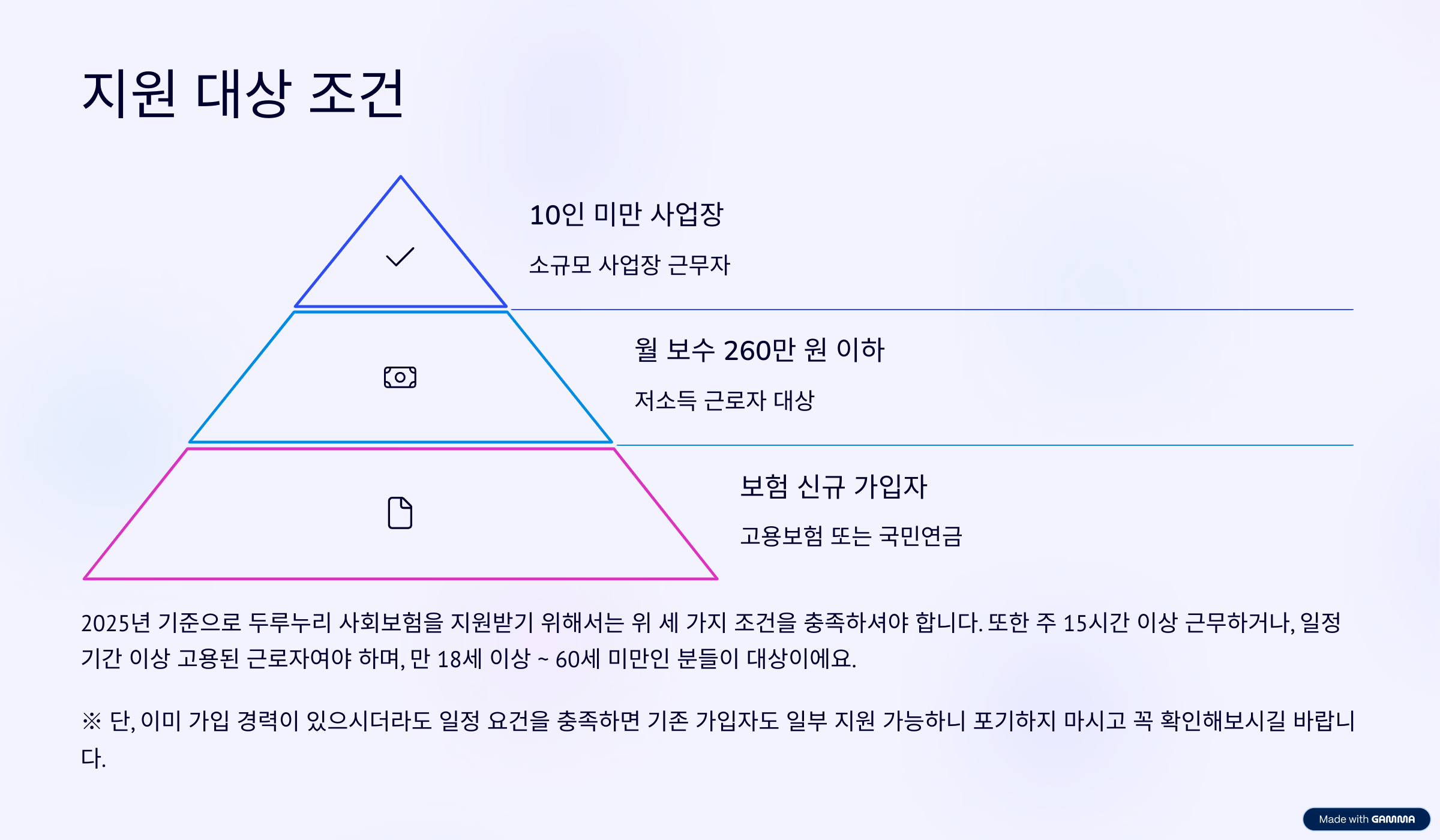 2025년 기준, 두루누리 사회보험을 지원받기 위해서는 아래 세 가지 조건을 충족해야 합니다.