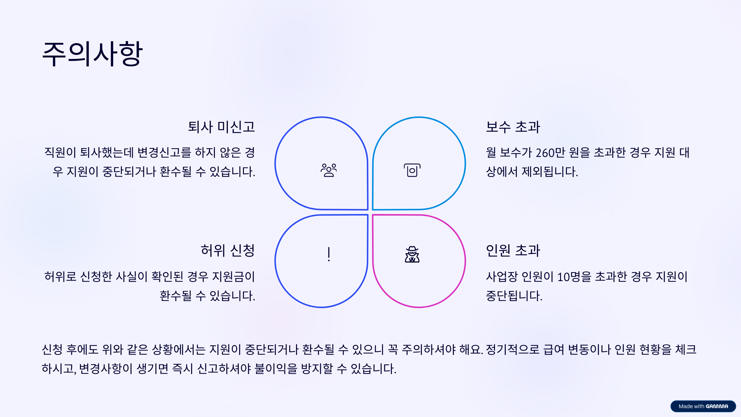 신청 후에도 아래와 같은 상황에서는 지원이 중단되거나 환수될 수 있으니 꼭 주의해야 합니다.