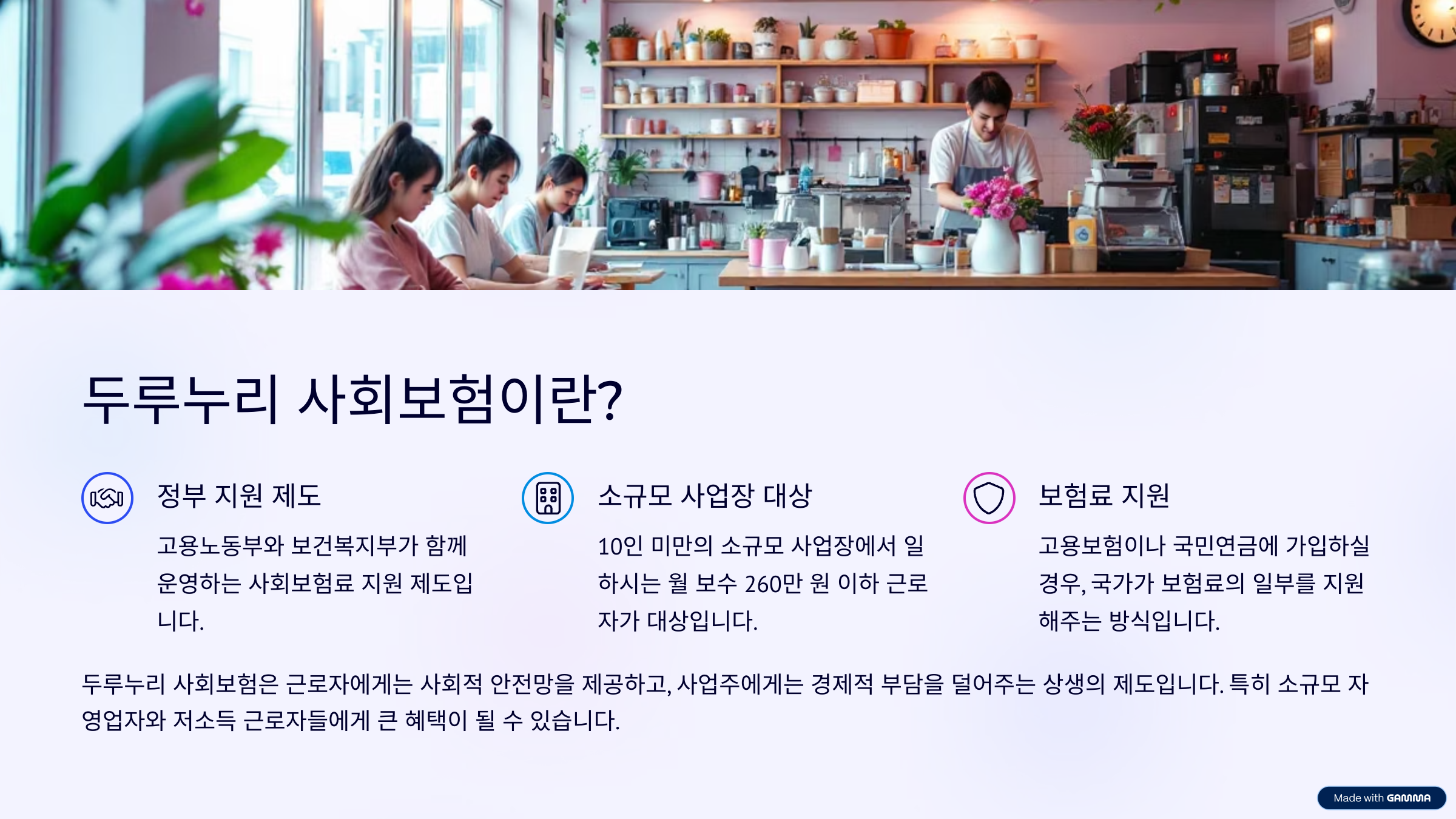 두루누리 사회보험은 고용노동부와 보건복지부가 함께 운영하는 사회보험료 지원 제도입니다. 10인 미만의 소규모 사업장에서 일하시는 월 보수 260만 원 이하 근로자가 고용보험이나 국민연금에 가입하실 경우, 국가가 보험료의 일부를 지원해 주는 방식입니다. 근로자는 보험 가입을 통해 고용 안정과 노후 대비를 할 수 있고, 사업주는 인건비 부담을 줄일 수 있기 때문에 서로에게 긍정적인 제도입니다.