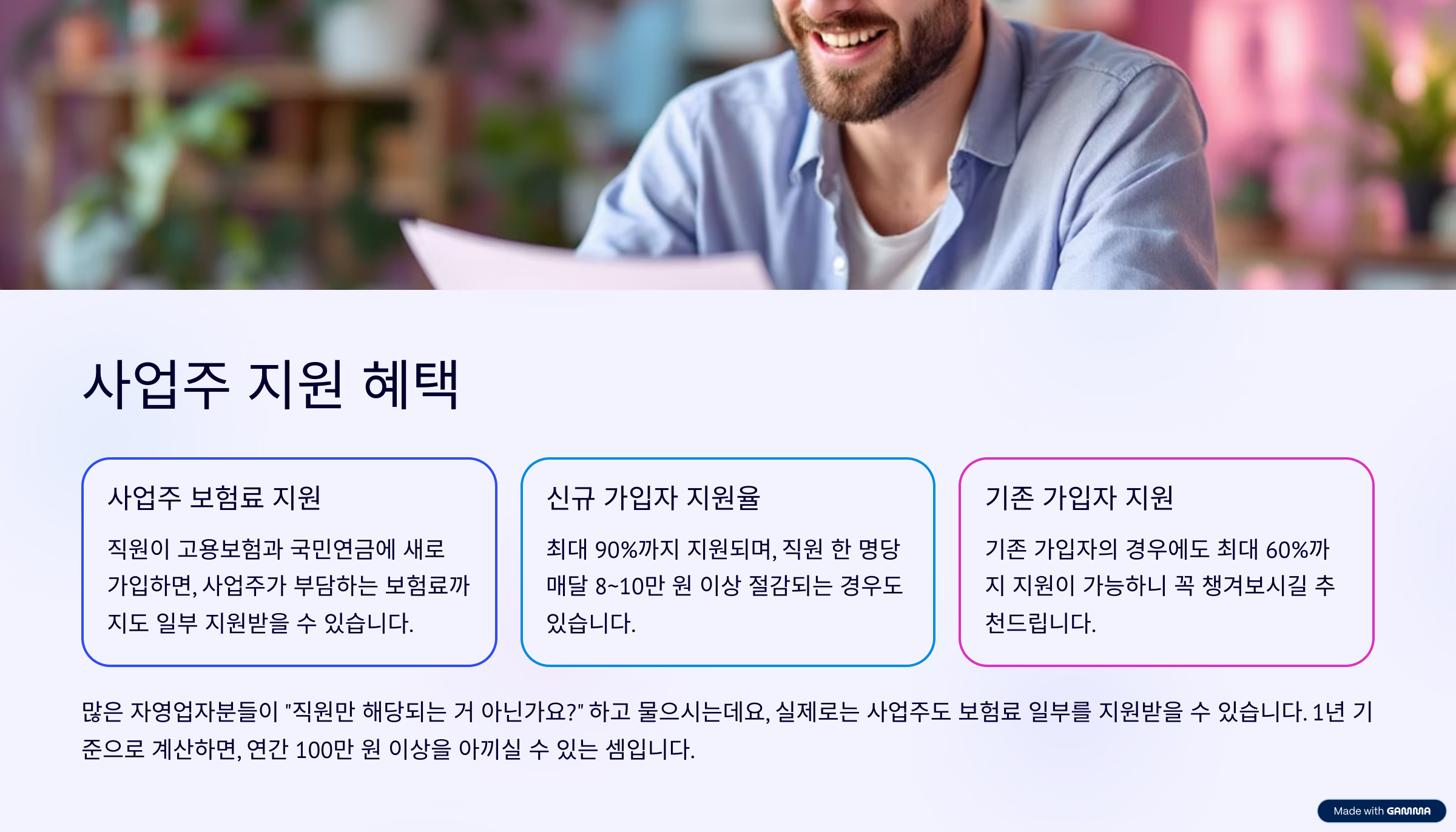 많은 자영업자분들이 직원들만 해당된다고 알고 계시는 분들이 많습니다. 실제로는 사업주도 보험료 일부를 지원받을 수 있습니다. 직원이 고용보험과 국민연금에 새로 가입하면, 근로자가 내야 할 금액뿐 아니라 사업주가 부담하는 보험료까지도 일부 지원받을 수 있습니다.
