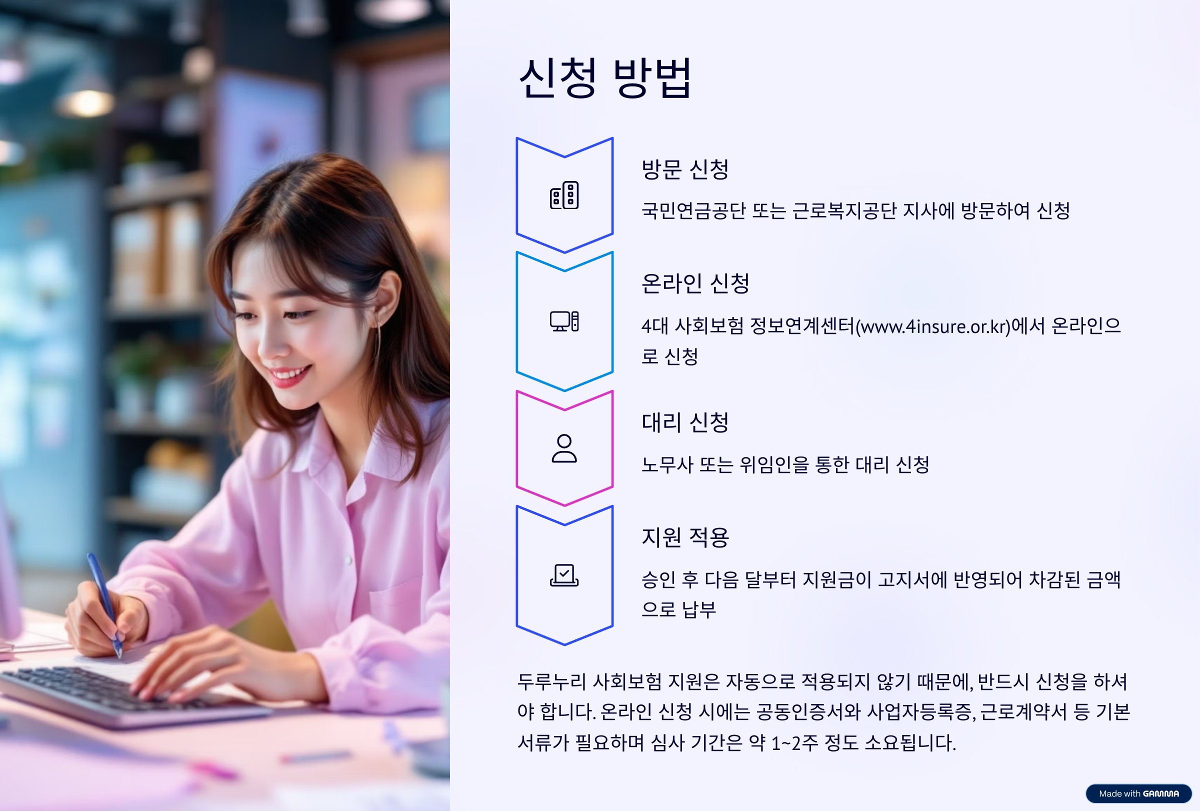 두루누리 사회보험 지원은 자동으로 적용되지 않기 때문에, 반드시 신청을 하셔야 합니다. 신청 방법은 다음 중 하나를 선택하시면 됩니다.