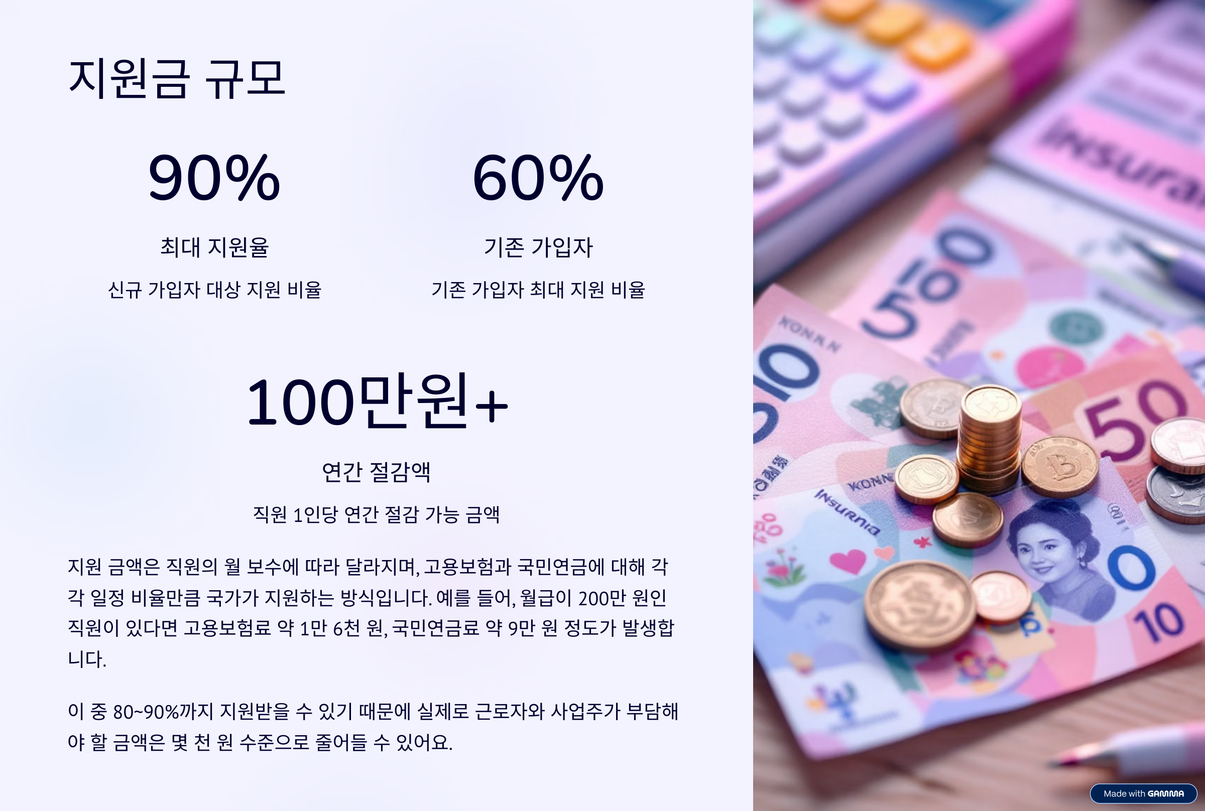 - 국민연금료 약 9만 원 정도 발생, 이 중 80~90%까지 지원받을 수 있기 때문에, 실제로 근로자와 사업주가 부담해야 할 금액은 몇 천 원 수준으로 줄어들 수 있습니다.