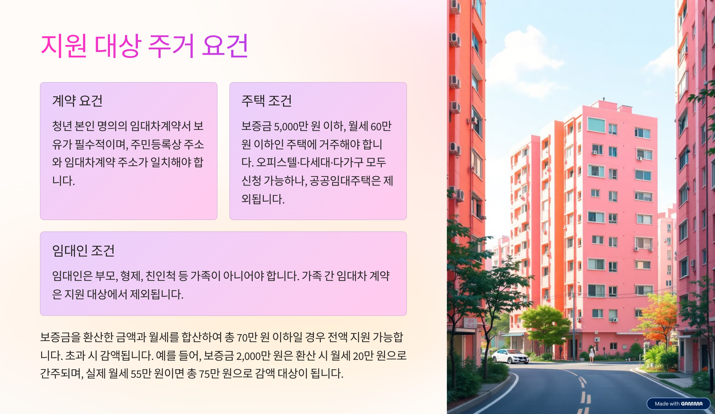 ※ 보증금을 환산한 금액과 월세를 합산하여 총 70만 원 이하일 경우 전액 지원 가능합니다. 초과 시 감액됩니다.