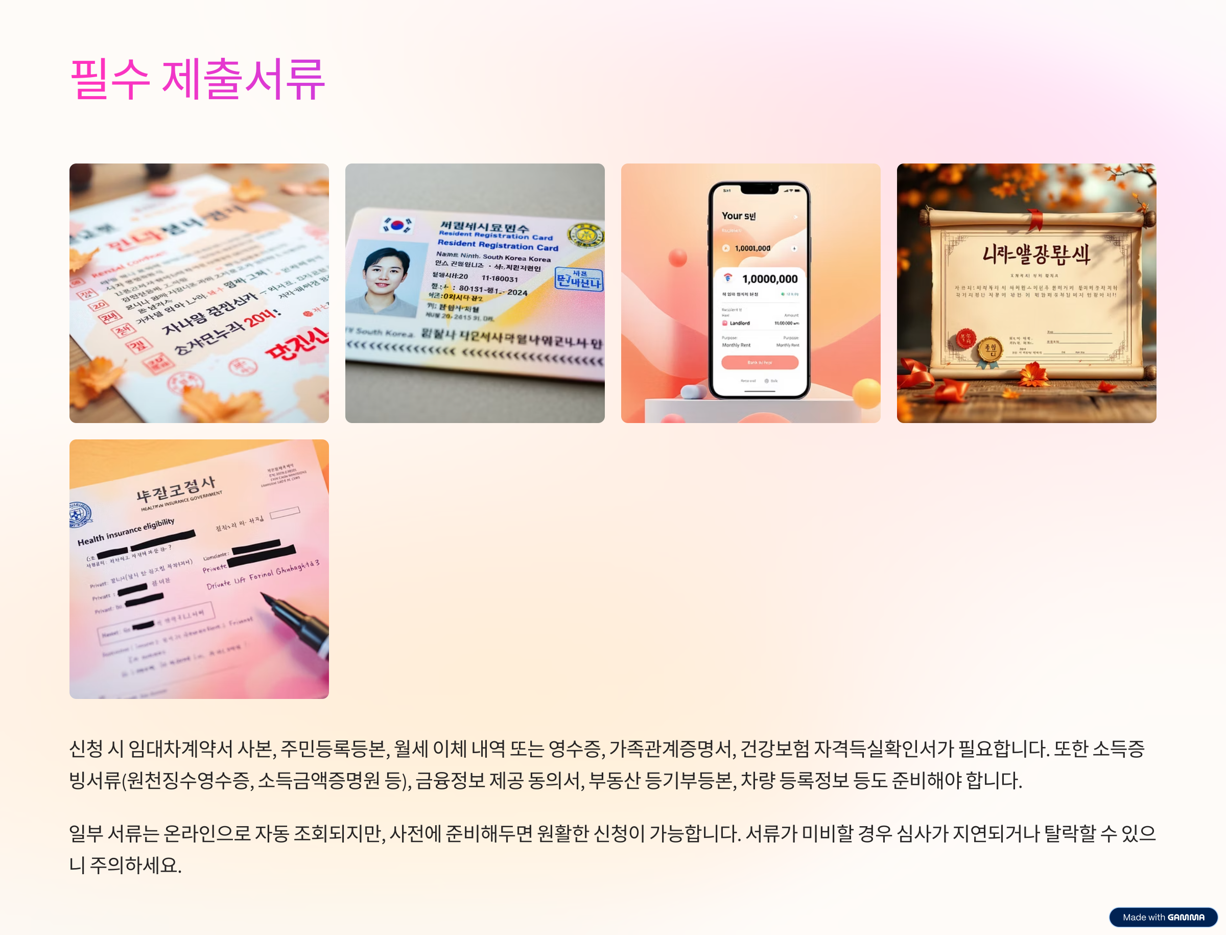 신청 시 아래 서류들을 준비해야 합니다. 일부는 온라인으로 자동 조회되지만, 사전에 준비해 두면 원활한 신청이 가능합니다.