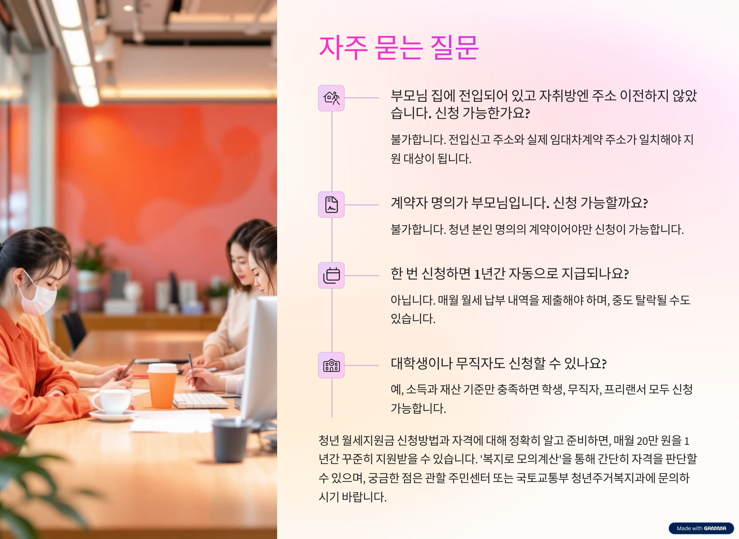• 중간에 전입신고를 변경하거나, 자격 조건이 변경될 경우 지급이 중단될 수 있습니다.