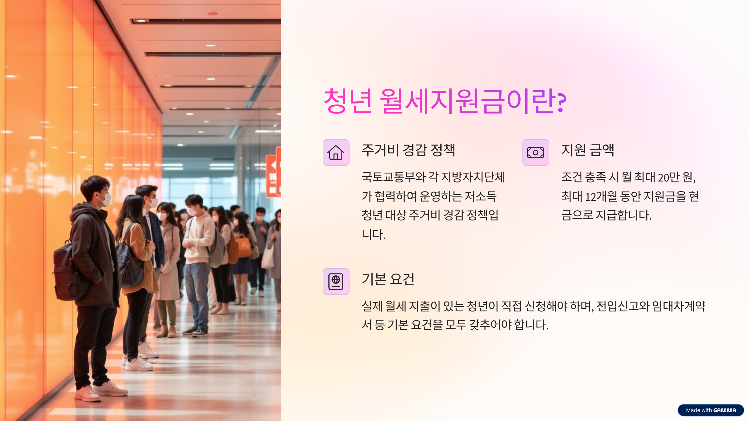 최근 물가와 전셋값, 월세 모두 상승하면서 청년 1인 가구의 주거 부담이 커지고 있습니다. 특히 취업 준비생이나 사회 초년생의 경우, 고정 지출인 월세는 상당한 부담으로 작용합니다. 이런 현실을 반영하여 정부는 청년 월세지원금 제도를 마련하였습니다. 이 제도는 일정 기준을 충족하는 청년에게 매월 최대 20만 원씩, 12개월간 총 240만 원까지 월세를 지원하는 복지정책입니다.