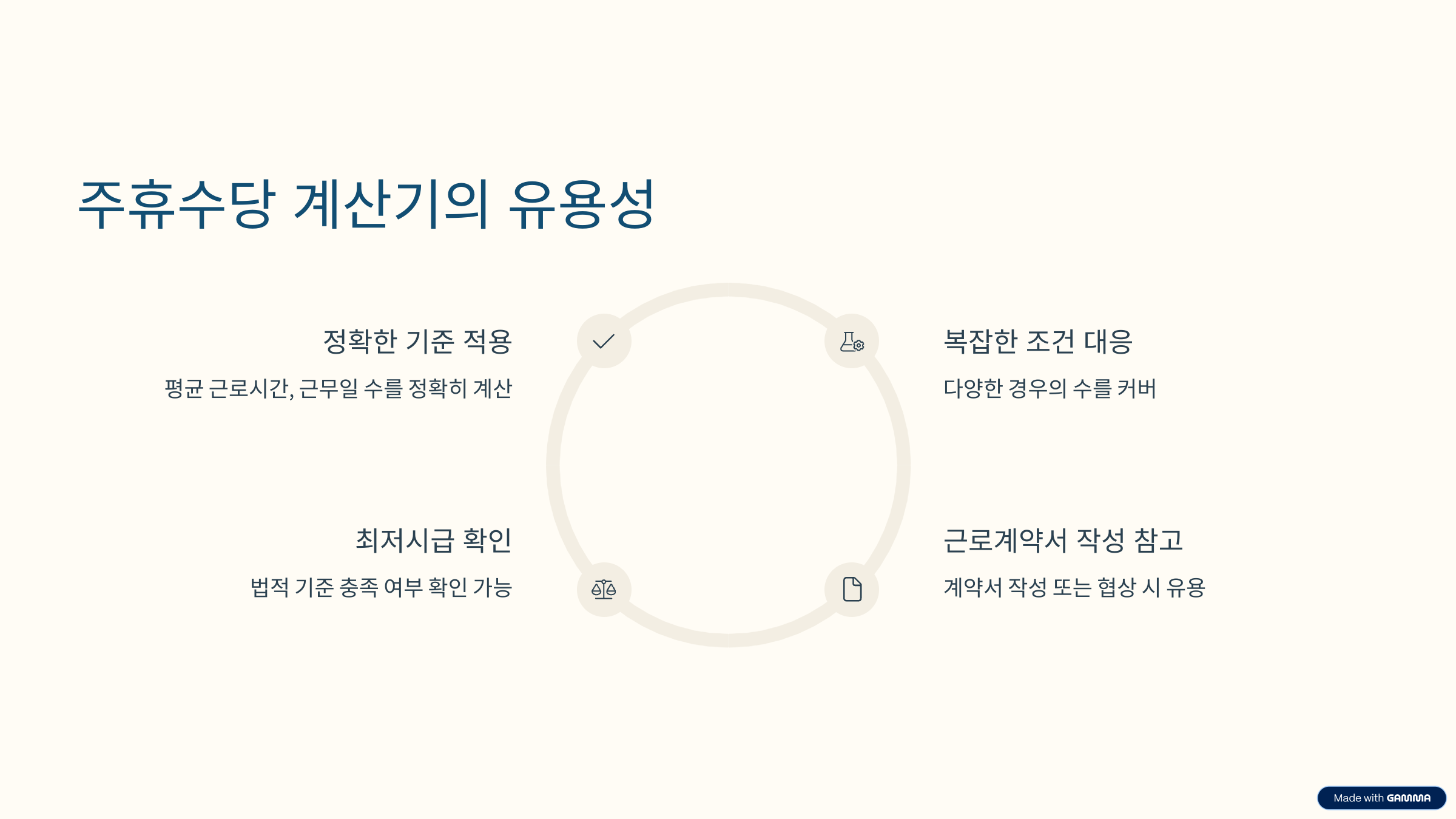 - 정확한 기준 적용: 평균 근로시간, 근무일 수를 정확히 계산해 줍니다.
