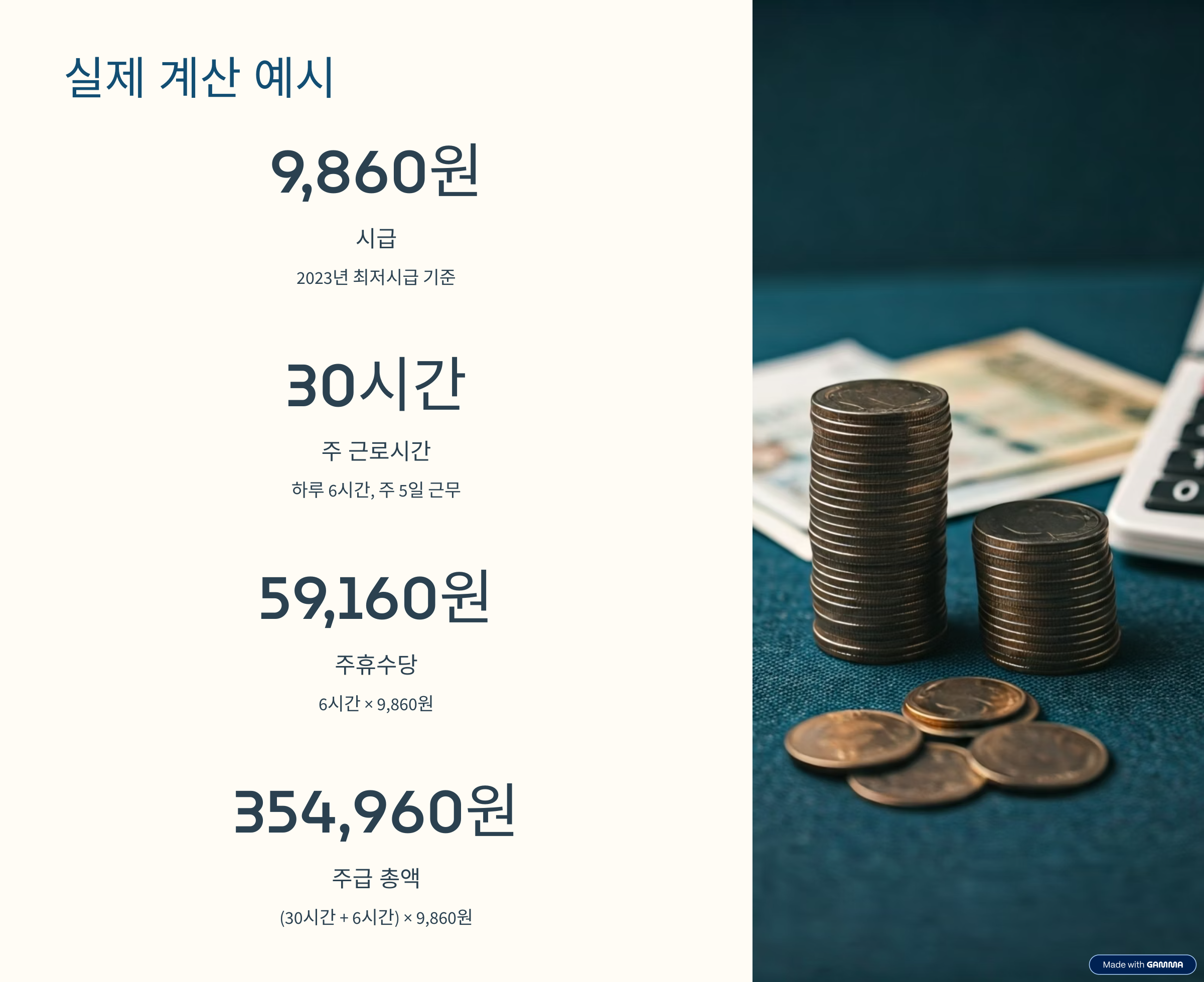 주휴수당은 최저시급 산정에도 영향을 미칩니다. 예를 들어, 주휴수당이 포함되지 않았는데 시급이 9,860원이라면, 실질적으로는 최저시급 미만으로 볼 수 있습니다. 주휴수당이 법정 기준에 따라 지급되지 않으면 사업주는 최저임금법 위반으로 처벌받을 수 있어요. 그렇기 때문에 ‘시급 10,000원’이라고 해도, 주 15시간 이상 일하고 주휴수당이 없다면 법적으로 문제가 될 수 있습니다. 계산기로 체크하면 이런 상황도 사전에 방지할 수 있습니다.