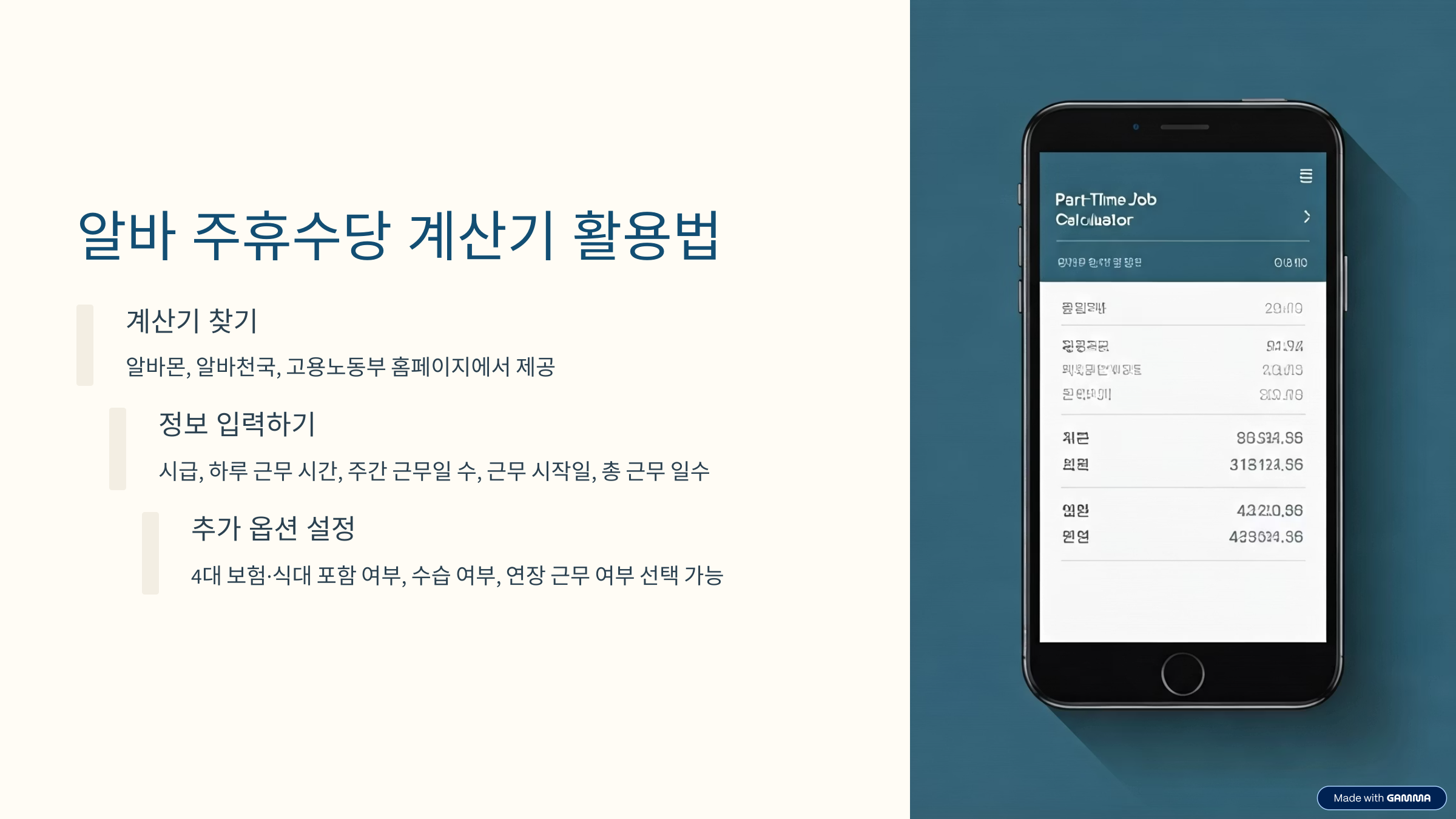 주휴수당 받는 건가요? 아르바이트를 하다 보면 누구나 한 번쯤 궁금해하는 질문입니다. 매주 일한 만큼 돈은 받고 있는지, 사장님이 말한 ‘시급 포함 월급’이 정말 맞는지 헷갈리는 순간도 있죠. 그럴 땐 알바 주휴수당 계산기를 활용해 보는 게 가장 확실한 방법이에요.