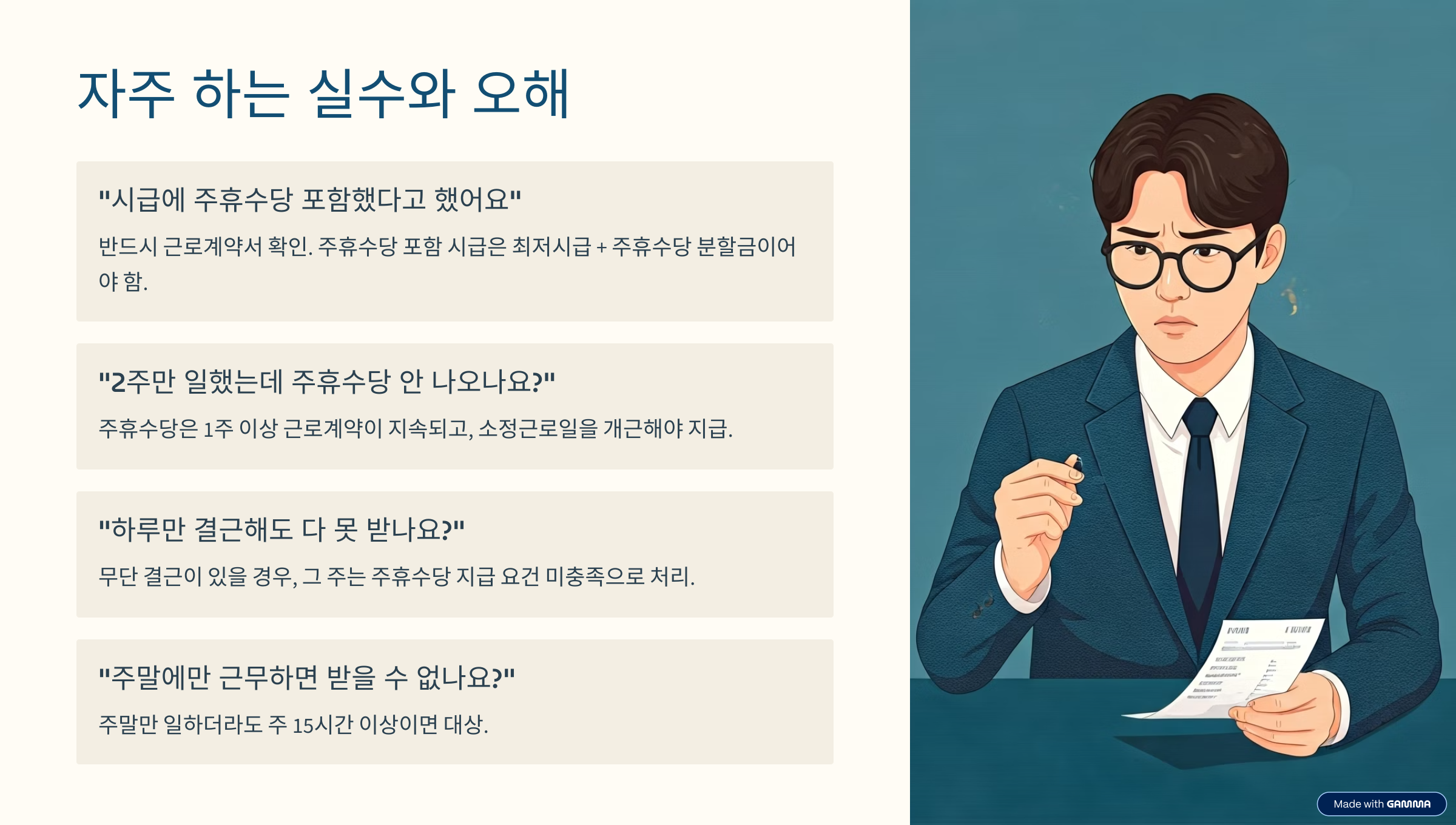 - "사장님이 시급에 주휴수당 포함했다고 했어요" → 반드시 근로계약서 확인