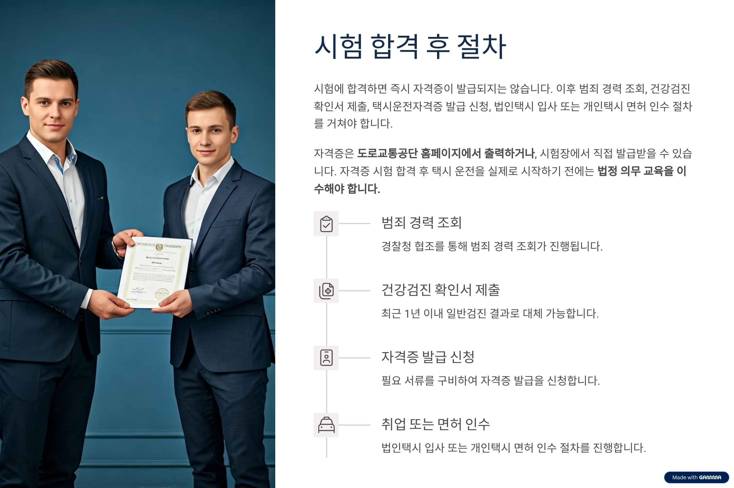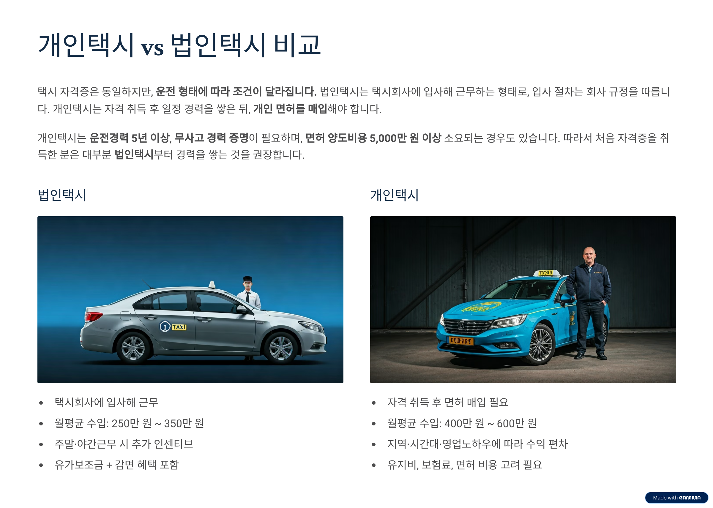 - 개인택시: 자격 취득 후 일정 경력을 쌓은 뒤, 개인 면허 매입 필요