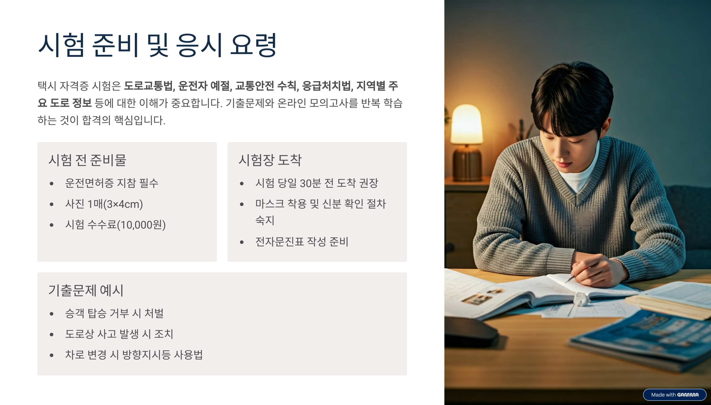 - 시험장 위치 및 교통 미리 확인, 늦지 않도록 도착