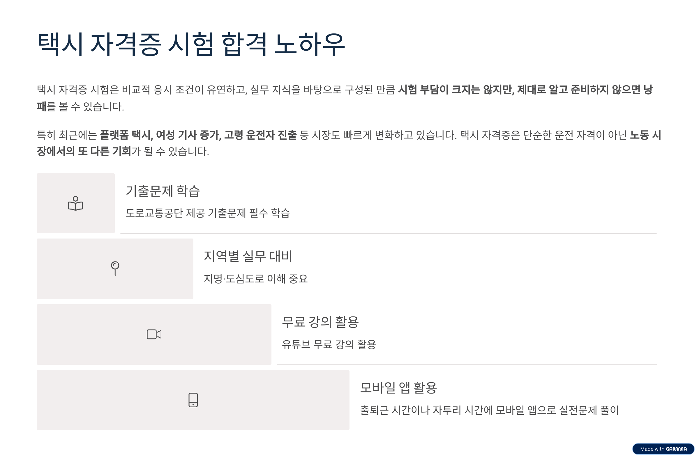 택시 자격증 시험은 비교적 응시 조건이 유연하고, 실무 지식을 바탕으로 구성된 만큼 시험 부담이 크지는 않지만, 제대로 알고 준비하지 않으면 낭패를 볼 수 있습니다. 특히 최근에는 플랫폼 택시, 여성 기사 증가, 고령 운전자 진출 등 시장도 빠르게 변화하고 있습니다. 택시 자격증은 단순한 운전 자격이 아닌 노동 시장에서의 또 다른 기회가 될 수 있습니다.