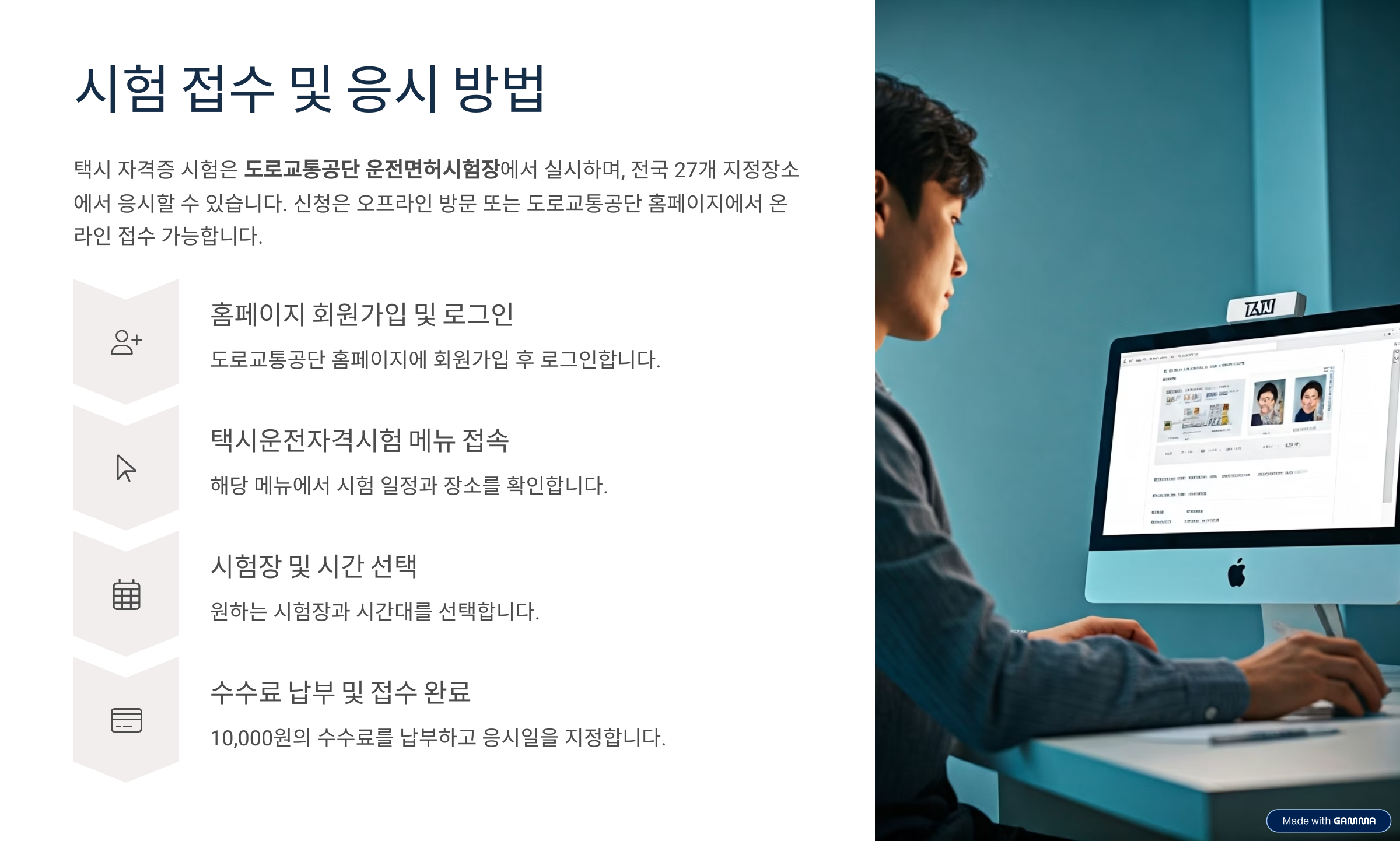택시 자격증 시험은 도로교통공단 운전면허시험장에서 실시하며, 전국 27개 지정장소에서 응시할 수 있습니다. 신청은 오프라인 방문 또는 도로교통공단 홈페이지(https://www.koroad.or.kr)에서 온라인 접수 가능합니다.