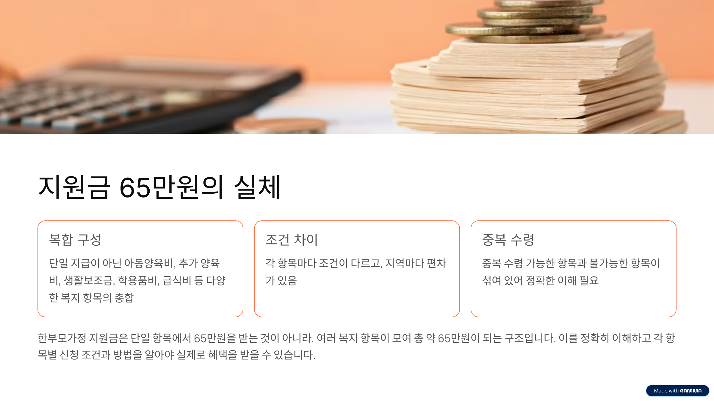 - 65만 원은 ‘총합’ 개념, 아동양육비+지자체 보조+학교 지원+단기 수당 등이 합쳐지는 구조
