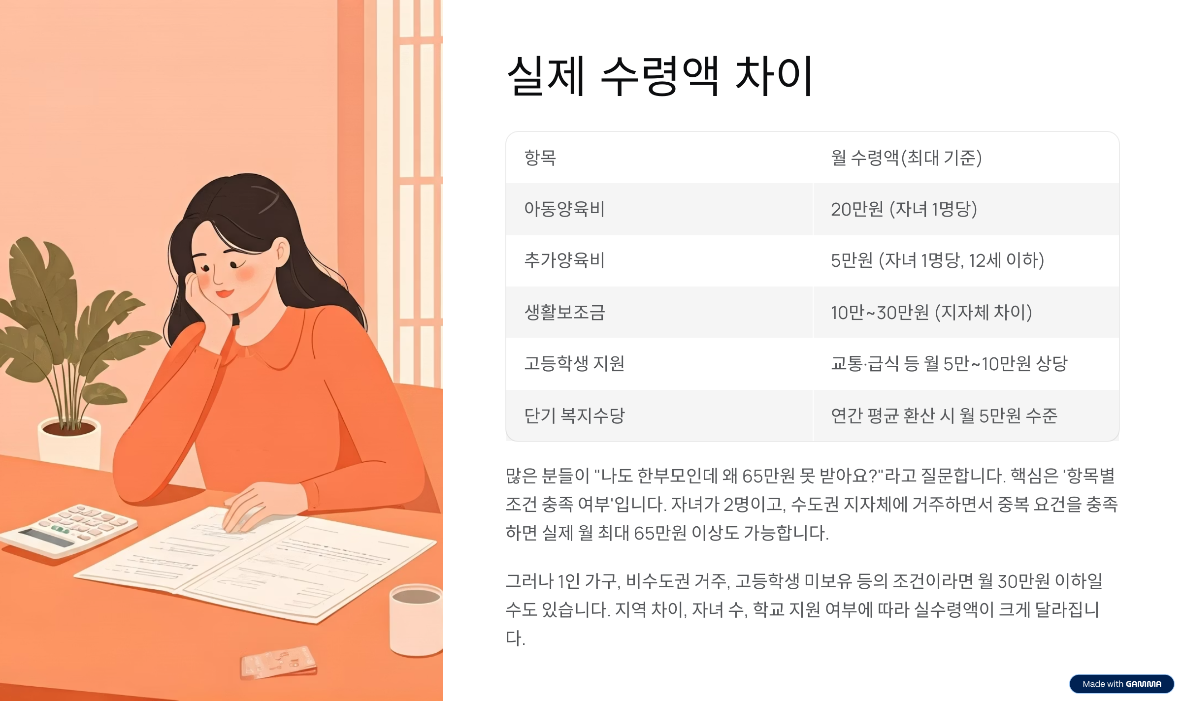 자녀가 2명이고, 수도권 지자체에 거주하면서 중복 요건을 충족하면 실제 월 최대 65만 원 이상도 가능하지만, 1인 가구·비수도권·고등학생 미보유라면 월 30만 원 이하일 수도 있습니다.