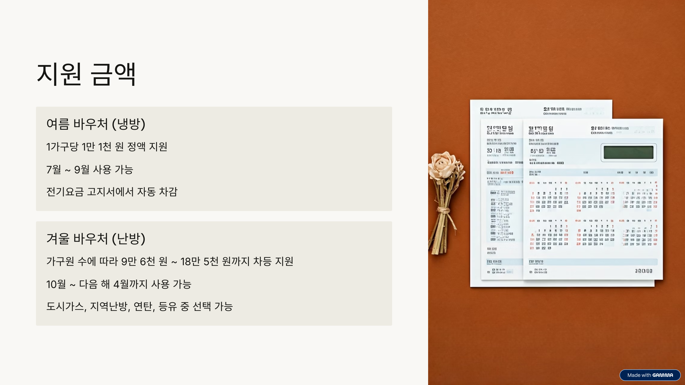 특히 겨울 바우처는 가정에서 실제로 가장 많이 사용하는 연료 방식에 맞춰 선택하여 사용할 수 있다는 점에서 유용합니다. 한 번 신청하면 여름과 겨울 모두 자동 지급되며, 별도로 다시 신청할 필요는 없습니다. 다만, 신청이 한 해 단위로 이뤄지기 때문에 매년 갱신 신청은 필수입니다.