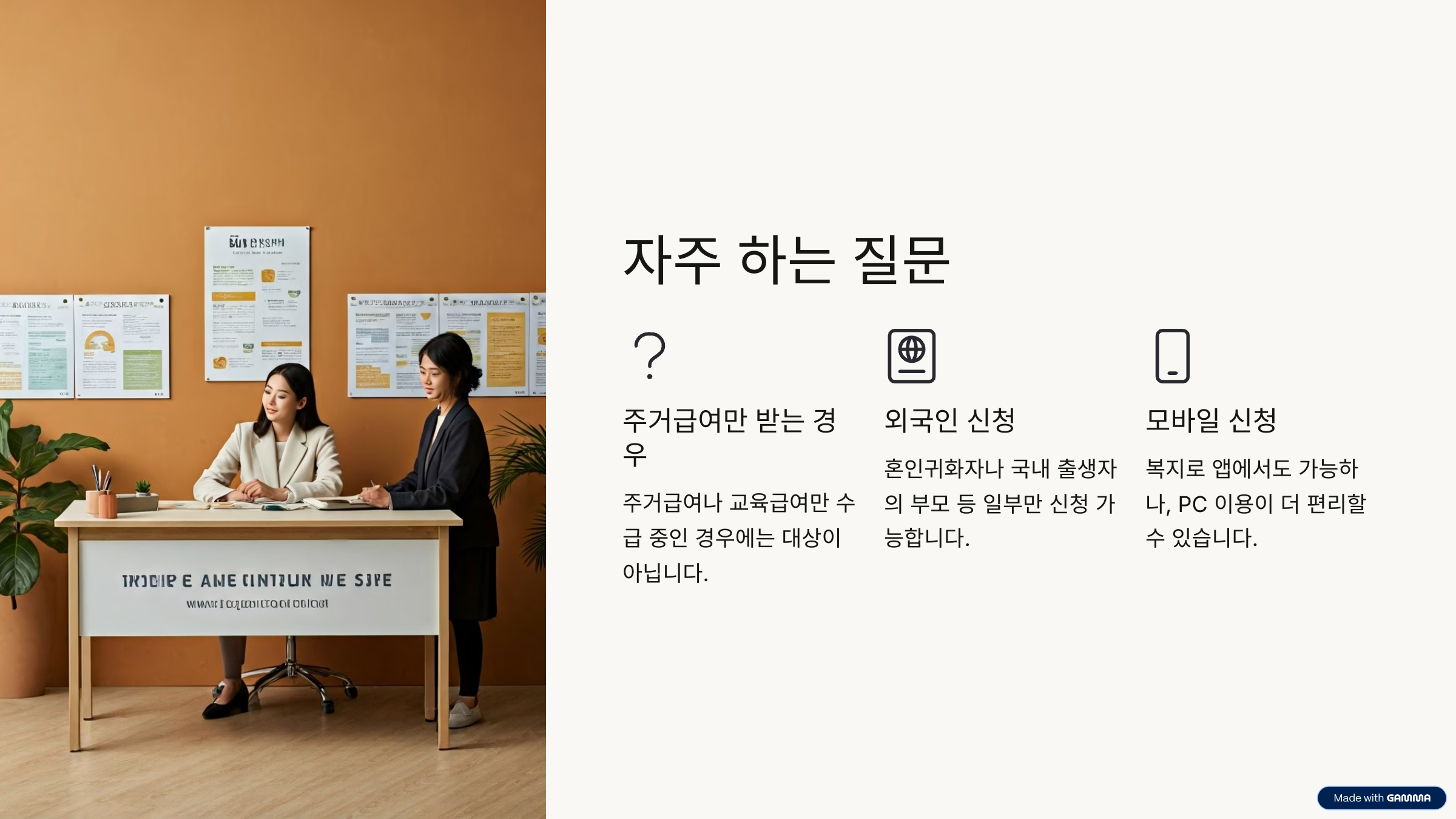 온라인 신청 시에는 공동인증서 또는 간편 인증을 통해 본인 확인 후 진행하시면 되고, 주민센터 방문 시에는 신분증, 수급자 증명서, 가족관계 확인 서류 등이 필요할 수 있으므로 담당 직원의 안내를 받는 것이 좋습니다.