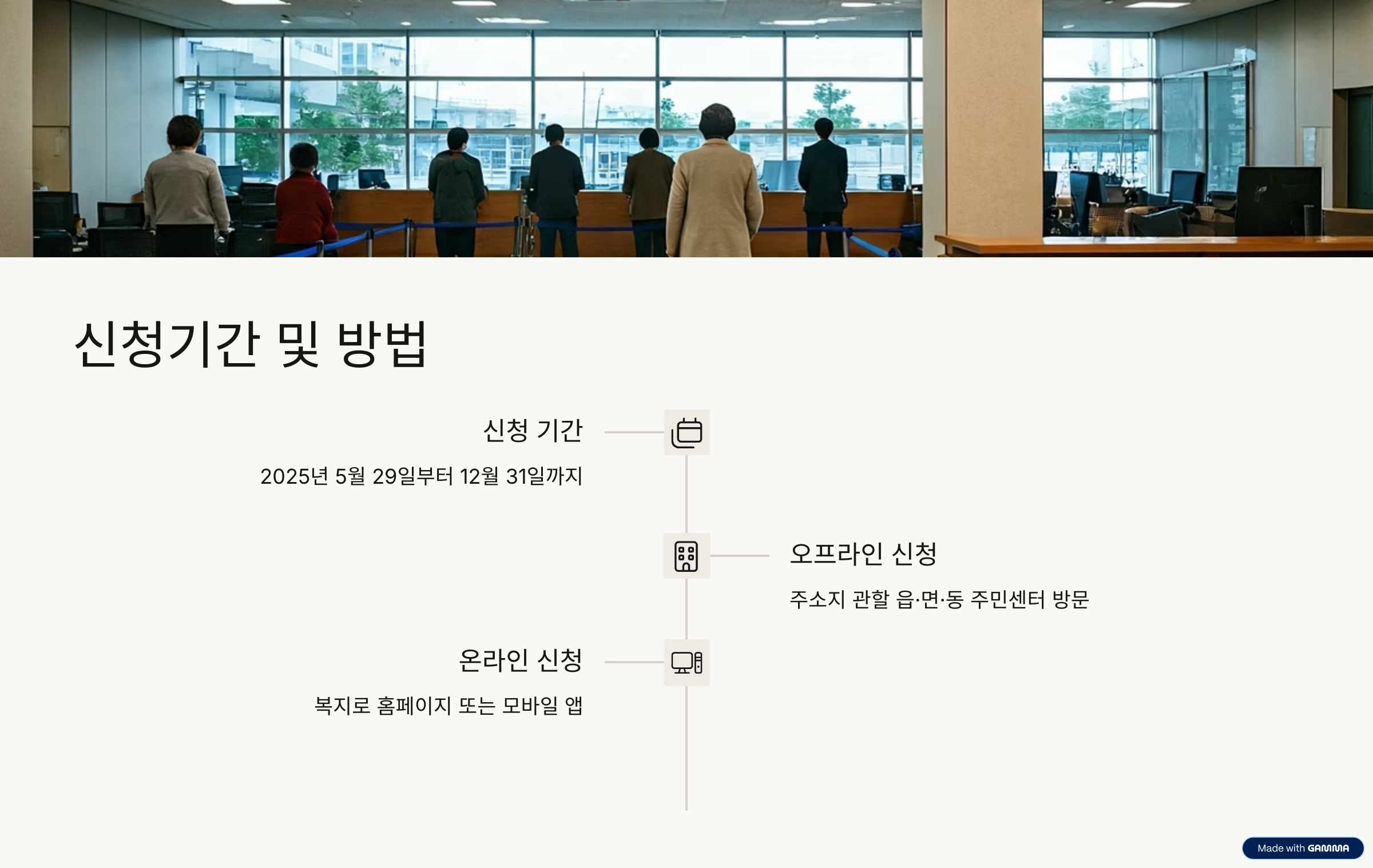 - 오프라인 신청: 주소지 관할 읍·면·동 주민센터 방문 신청