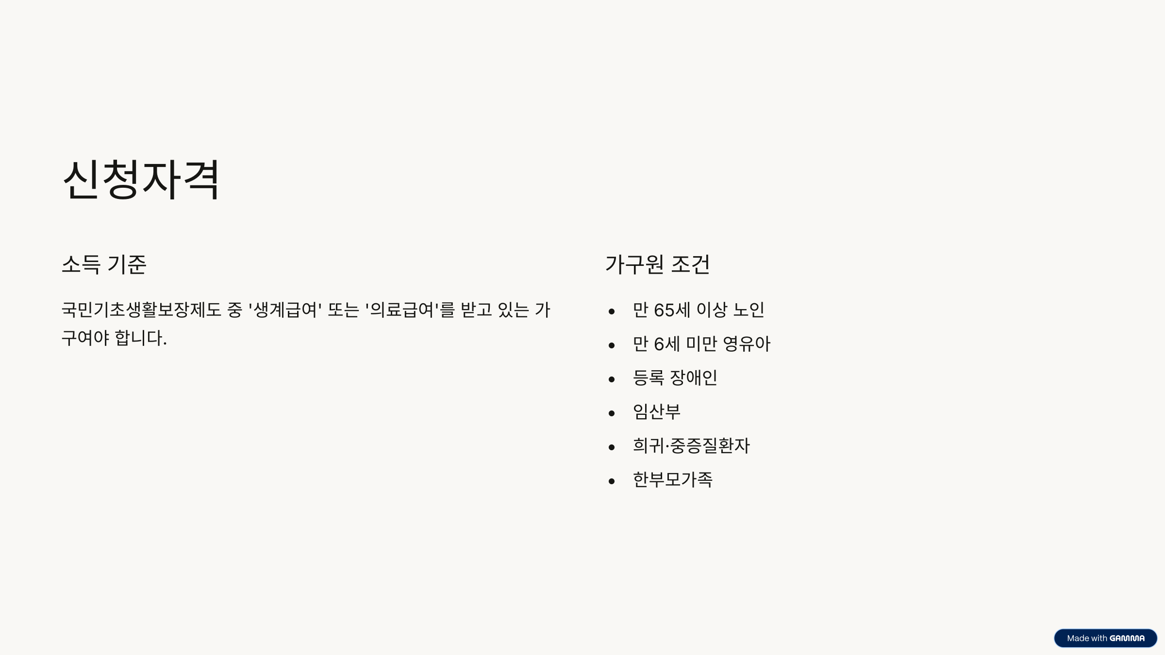 - 소득 기준: 국민기초생활보장제도 중 ‘생계급여’ 또는 ‘의료급여’를 받고 있는 가구여야 합니다.