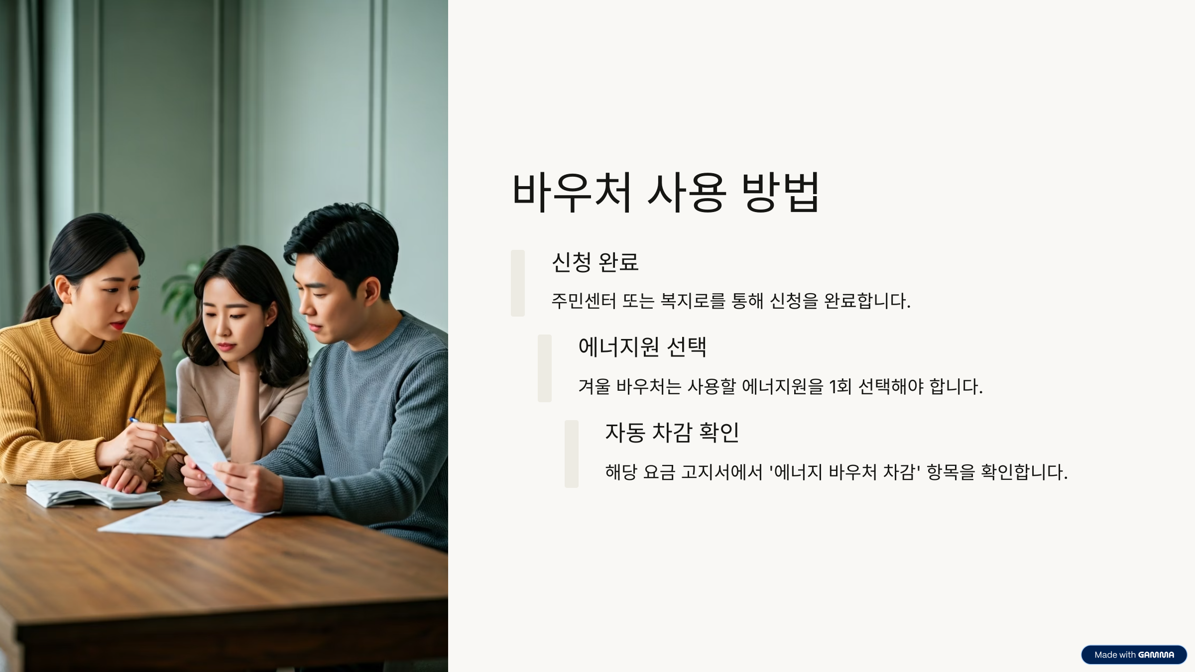 바우처는 실물 카드나 현금으로 제공되지 않으며, 해당 요금 고지서에서 자동으로 차감되는 방식으로 사용됩니다. 예를 들어 전기요금 고지서에 ‘에너지 바우처 차감’ 항목이 나타나며, 그만큼 납부할 금액이 줄어듭니다. 또한 도시가스나 연탄 등 연료를 사용하는 겨울 바우처는 지정된 유통업체에서의 구매 시에만 사용 가능하므로 사용 전에 반드시 사용처를 확인하셔야 합니다.
