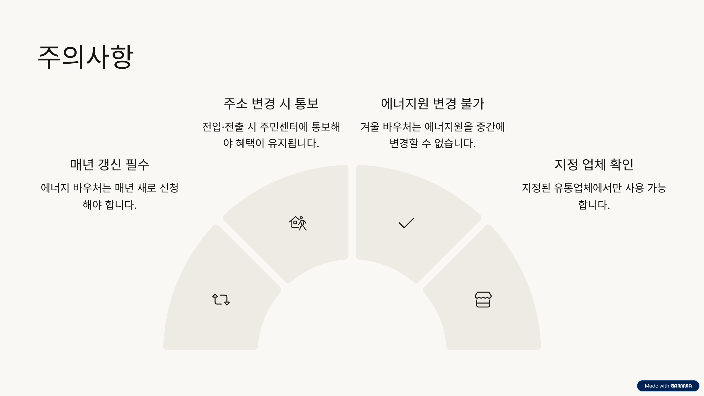 - 겨울 바우처는 에너지원을 1회 선택해야 하며, 사용 중간에 변경할 수 없습니다.