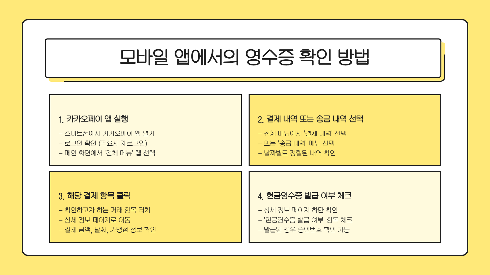많은 분들이 카카오페이 앱에서 ‘현금영수증’ 메뉴를 찾지만, 사실 모바일 앱에서는 출력 기능이 제공되지 않습니다. 그 대신 다음 절차를 통해 현금영수증이 발급되었는지를 먼저 확인할 수 있습니다.