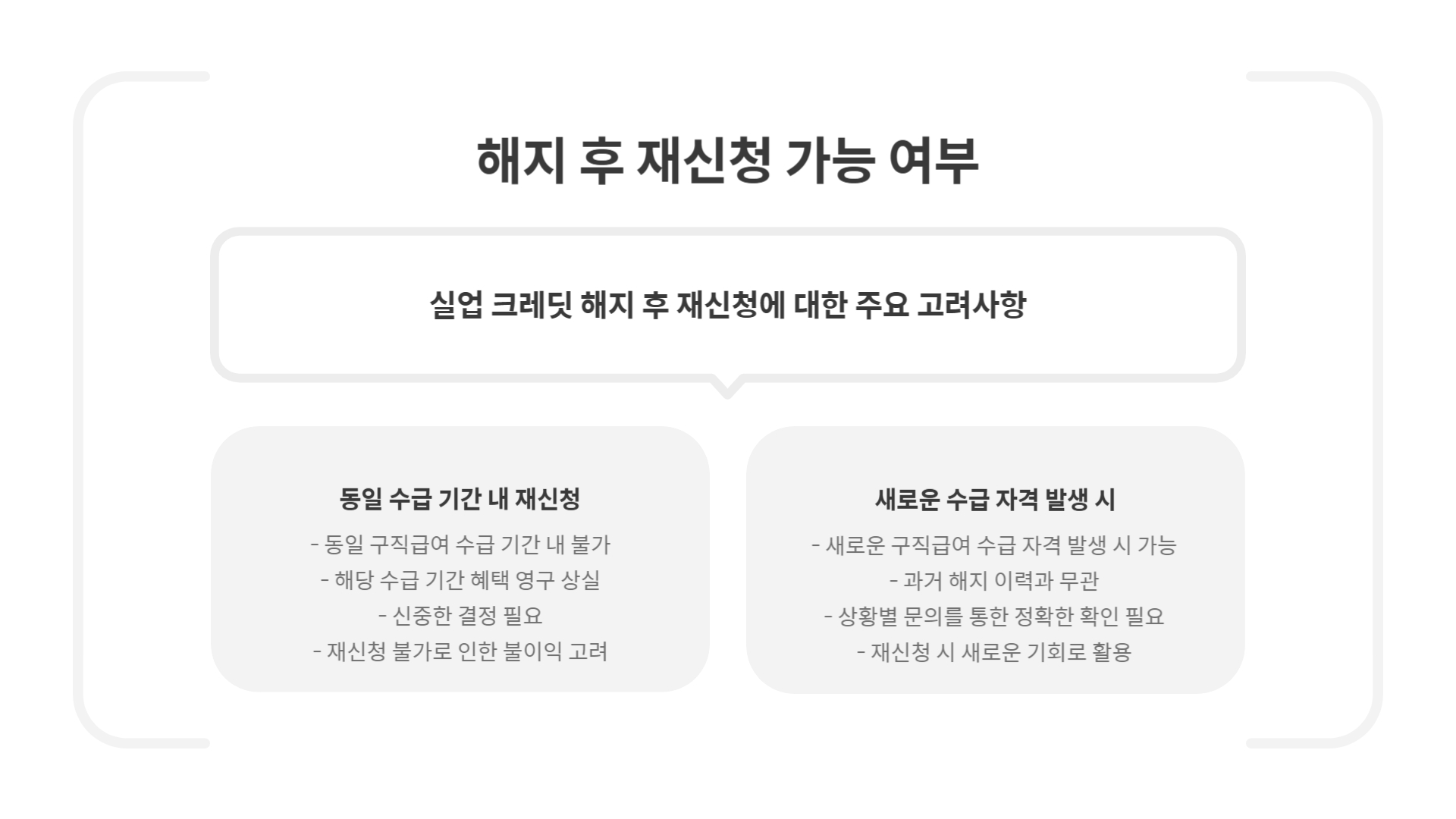 실업 크레딧 신청 해지를 한 경우, 동일한 구직급여 수급 기간 내에서는 재신청이 불가능한 것이 일반적입니다. 즉, 해지하면 해당 수급 기간에서는 다시 혜택을 받을 수 없기 때문에 신중한 결정이 필요합니다. 다만, 새로운 구직급여 수급 자격이 발생한 경우(예: 재실업)에는 다시 신청 자격이 생길 수 있습니다.