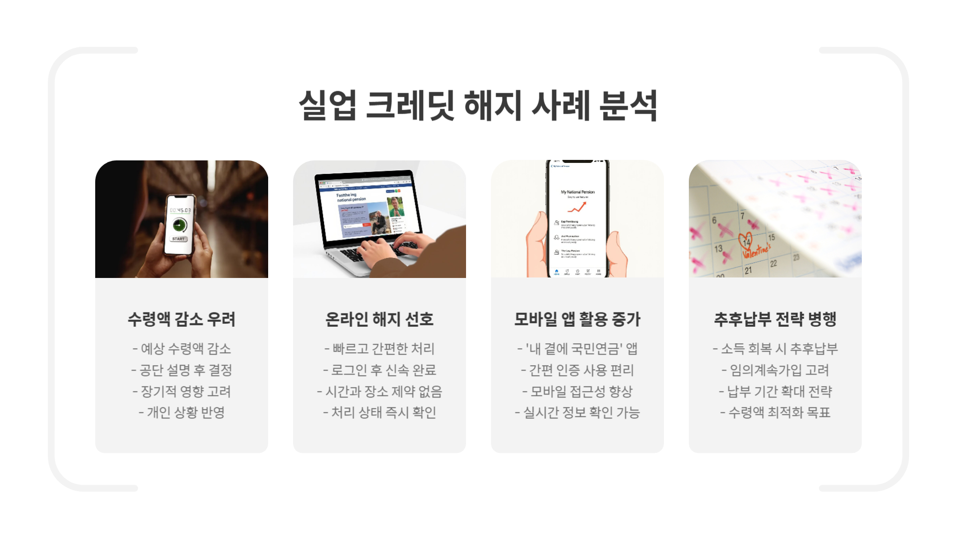 실업 크레디트 유지 시 예상 수령액이 오히려 줄어든다는 국민연금 공단의 설명을 듣고 해지를 결정한 경우가 많았습니다. - 온라인 해지 선호
