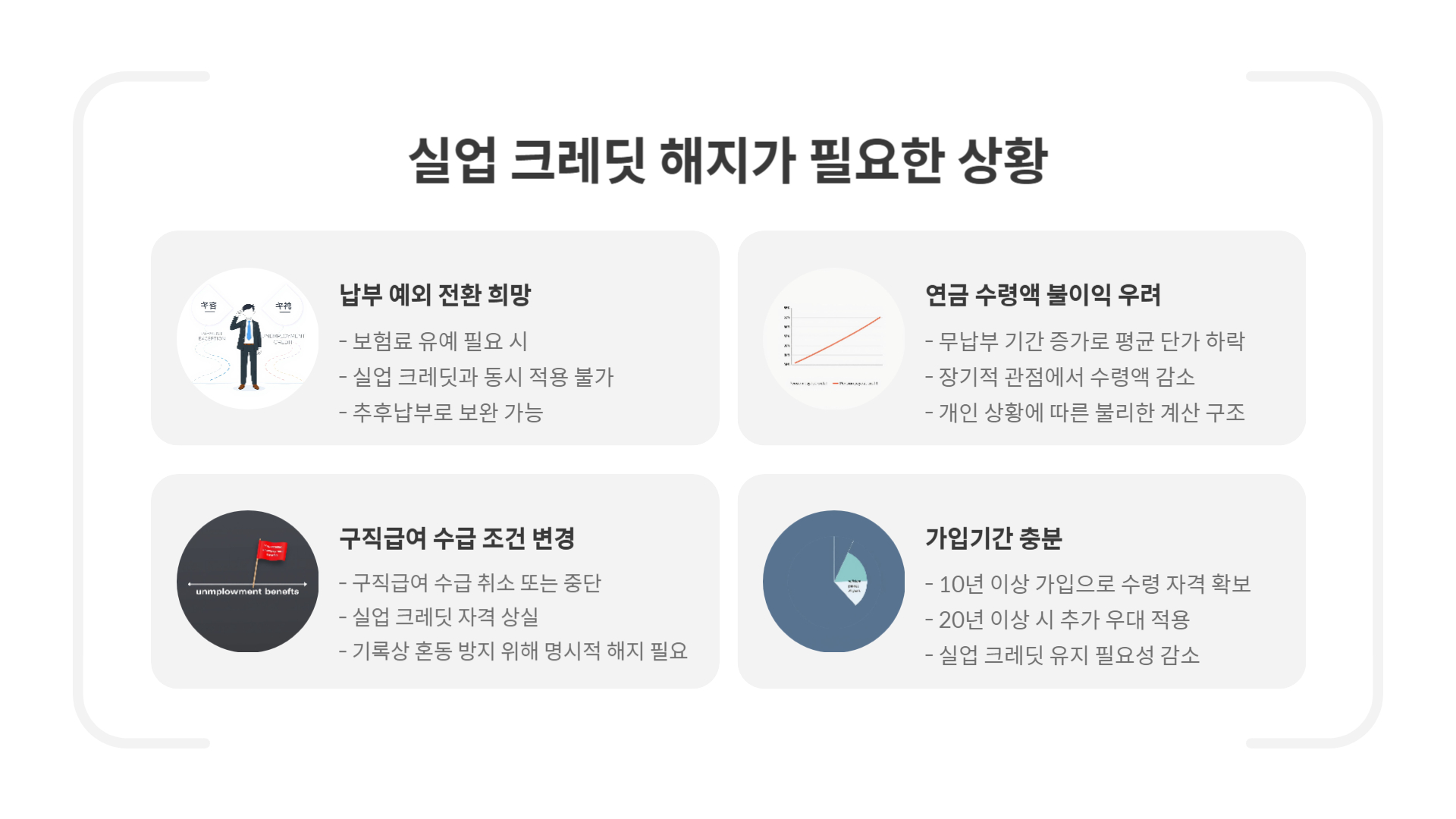 만약 이미 가입기간이 넉넉한 상황이라면, 굳이 실업 크레딧을 유지할 필요가 줄어듭니다.