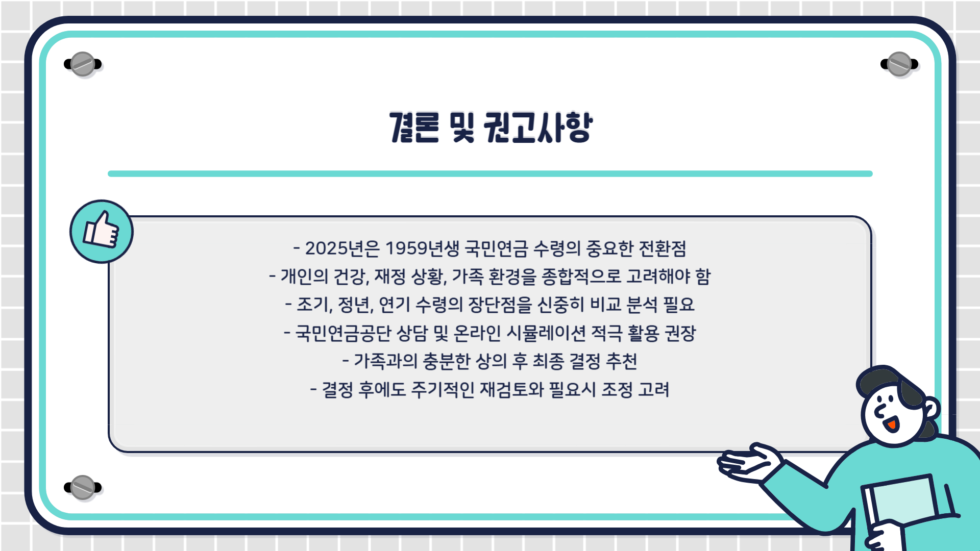 1959년생의 국민연금 수령은 2025년을 기점으로 본격 개시되는 중요한 노후 전환점입니다. 정년 수령은 가장 안정적이고 손해 없는 선택이지만, 조기 또는 연기 수령은 개인의 건강·소득·가족상황에 따라 매우 유리하거나 불리할 수 있습니다. 특히 수령액 감액이나 증액은 평생 적용되므로, 가벼운 선택이 아닌 중장기 인생 전략의 일부로 접근하셔야 합니다. 지금 바로 공단 홈페이지 또는 앱에서 예상 수령액을 확인하시고, 가족과 함께 시뮬레이션을 해보신 뒤 결정하시길 권해드립니다.