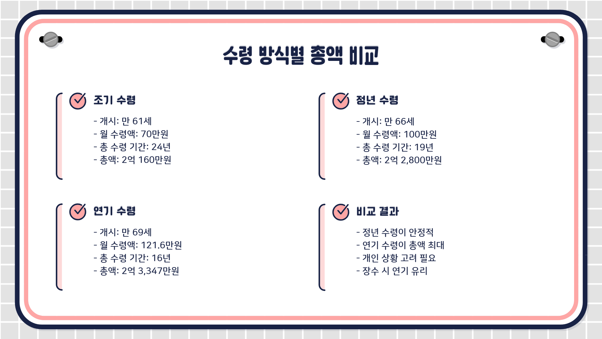 | 수령 방식 | 개시 시점 | 월 수령액 | 총 수령액 | 기간 총액 |