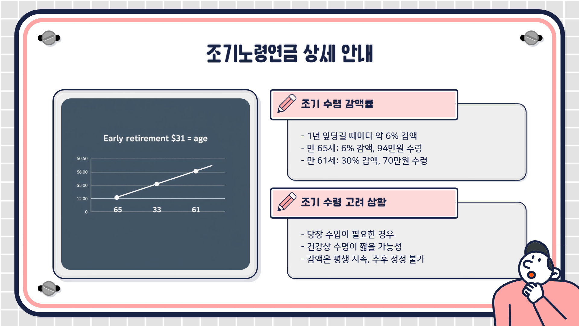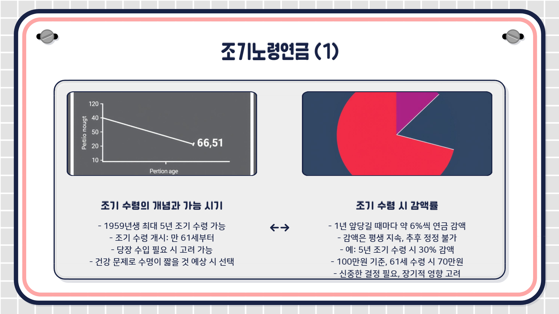 1959년생은 최대 5년까지 조기 수령 가능하며, 조기 수령 개시는 만 61세부터 가능합니다. 하지만 1년 앞당길 때마다 약 6%씩 연금이 감액되며, 조기 수령을 택할수록 수령액은 줄어듭니다.