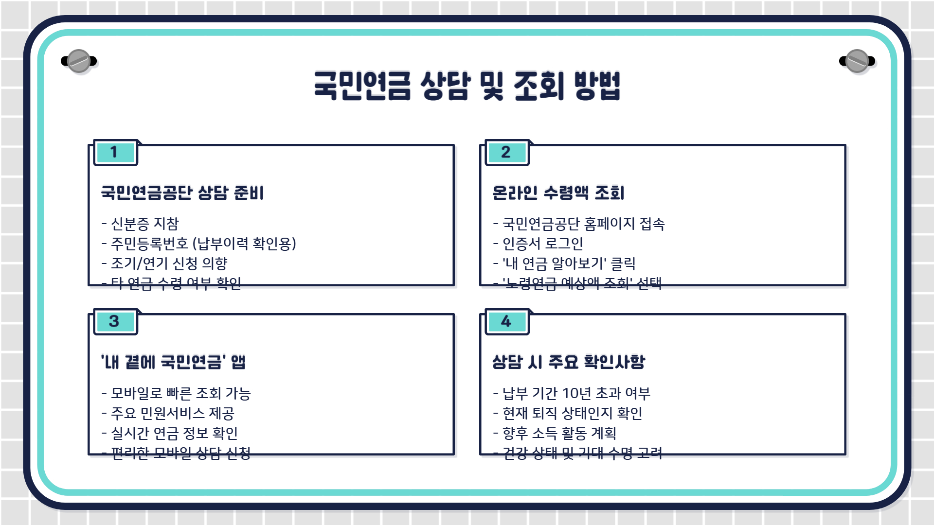 국민연금공단 고객센터(국번 없이 1355) 또는 지사에 방문 시, 아래 자료를 미리 준비하시면 상담이 더 효율적입니다.