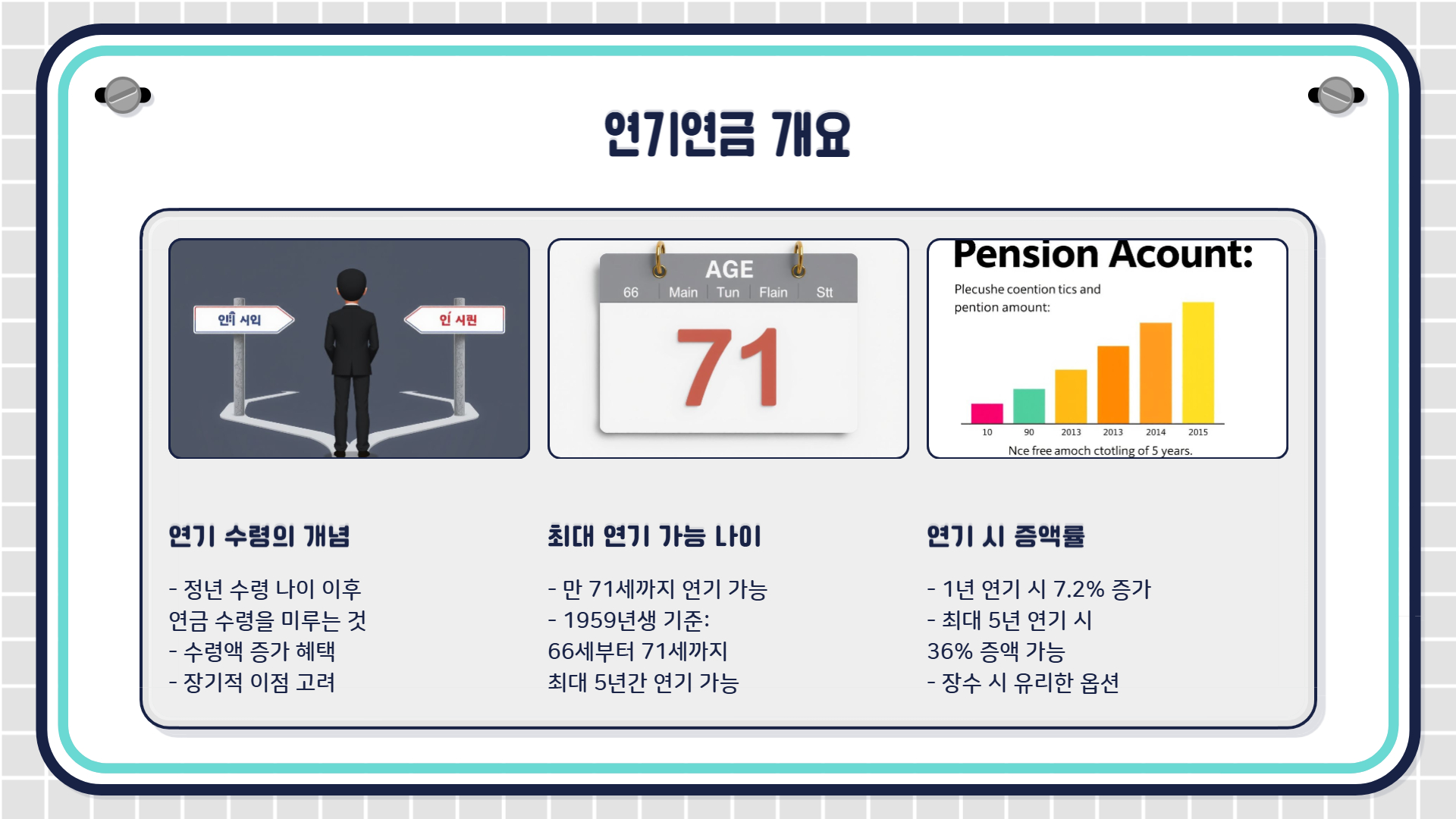 → 예상 수명이 85세라면 정년 수령이 손익분기점이 가장 안정적이며, 장수할수록 연기 수령이 유리해질 수 있습니다.