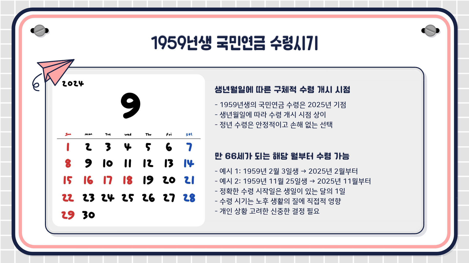→ 1959년생은 만 66세부터 정년 국민연금 수령 가능합니다.