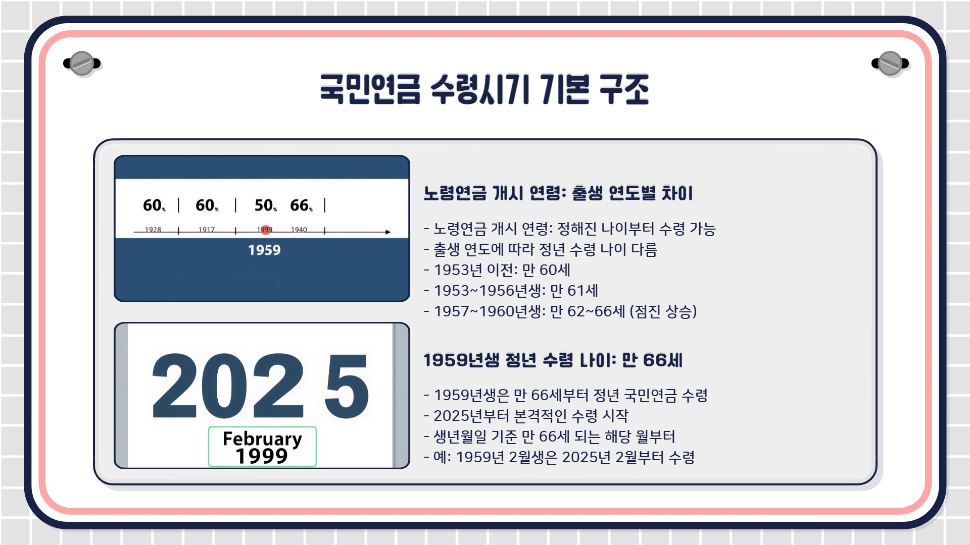 - 예: 1959년 11월 25일생 → 2025년 11월부터 수령 개시