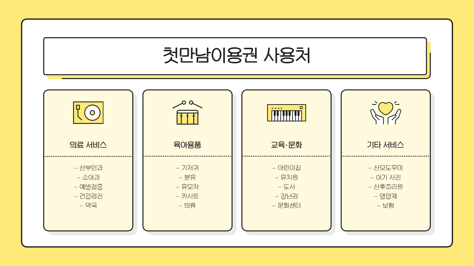대표적인 사용처로는 산부인과 진료비, 예방접종비, 영유아 건강검진비, 소아과 진료비, 약국 의약품 구입 등이 있습니다. 또한 육아용품 전문점, 아기 전용 쇼핑몰, 일부 온라인몰에서도 사용할 수 있습니다. 단, 외식·숙박·일반 마트·주유소 등에서는 사용할 수 없습니다.