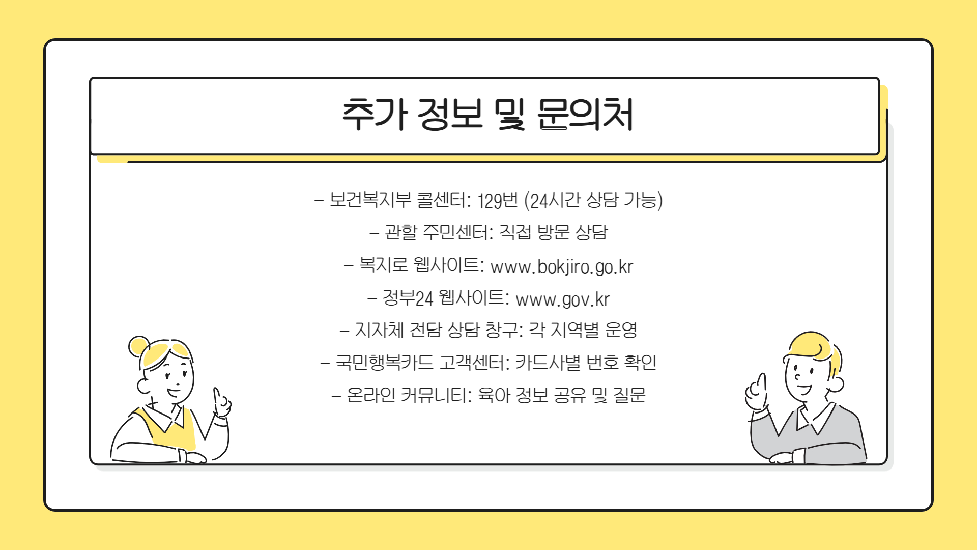 첫만남이용권 사용방법에 대해 추가로 궁금한 사항은 보건복지부 콜센터(129번), 관할 주민센터, 복지로·정부 24 사이트를 통해 안내받을 수 있습니다. 각 지자체에서도 전담 상담 창구를 운영하므로 편리하게 문의하실 수 있습니다.