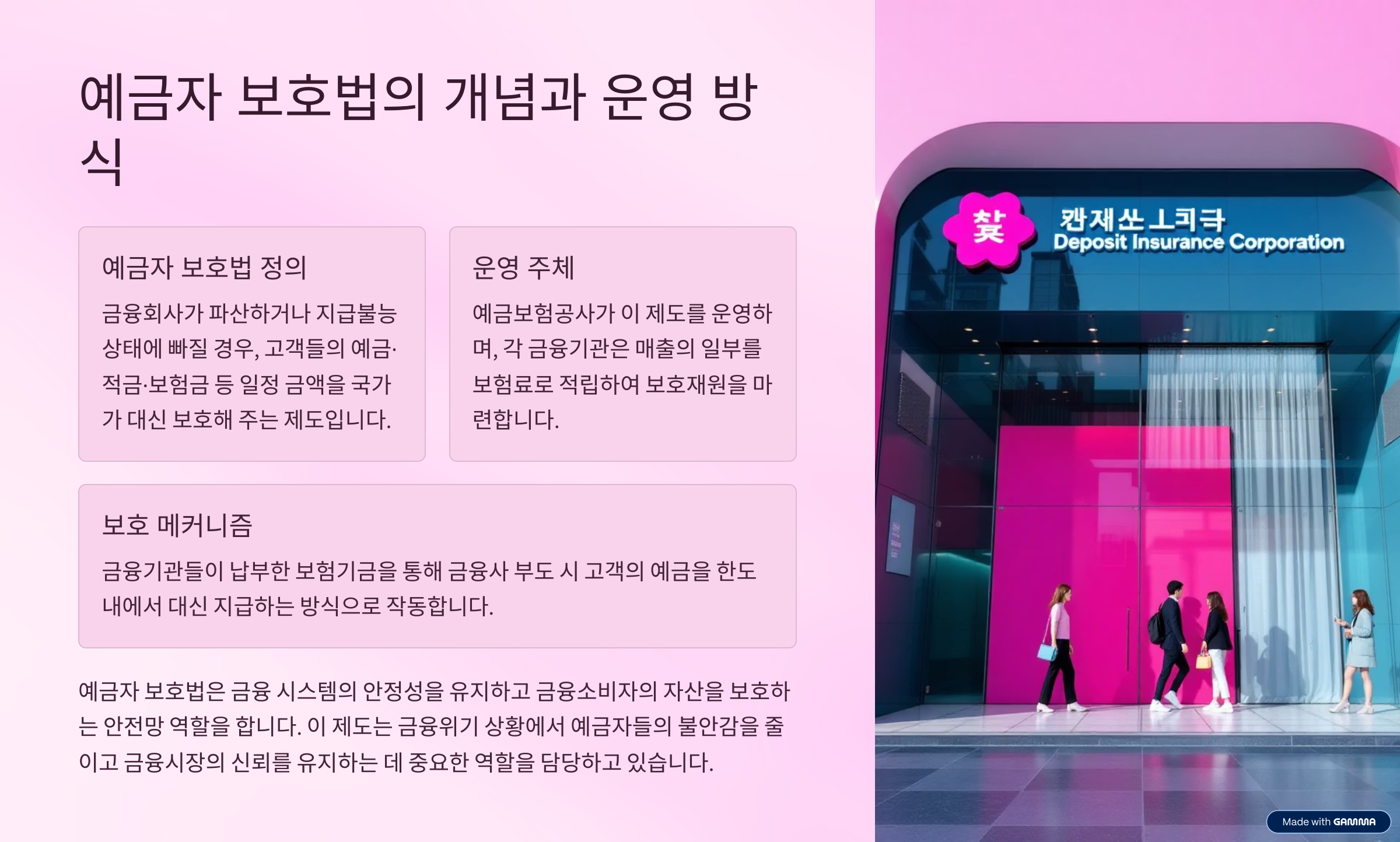 현재 예금보험공사가 이 제도를 운영하고 있으며, 각 금융기관이 매출의 일부를 보험료로 적립하여 보호재원을 마련하고 있습니다. 이렇게 모은 보험기금이 금융사 부도 시 고객의 예금을 대신 지급하는 방식입니다.