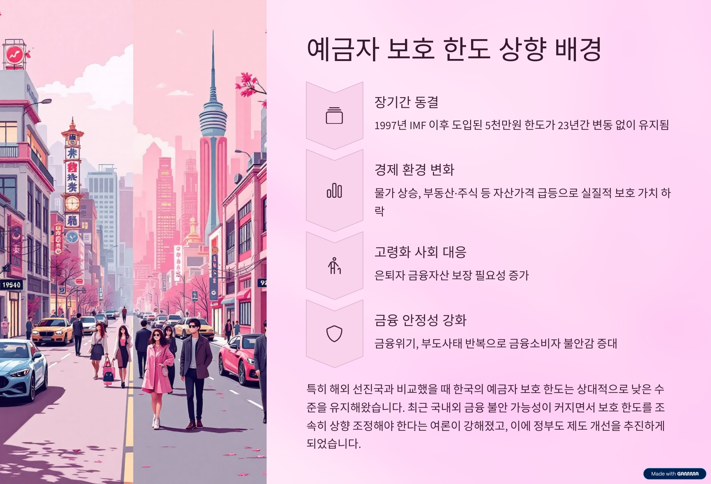 - 1997년 IMF 이후 5천만 원 한도 도입 → 23년간 동결
