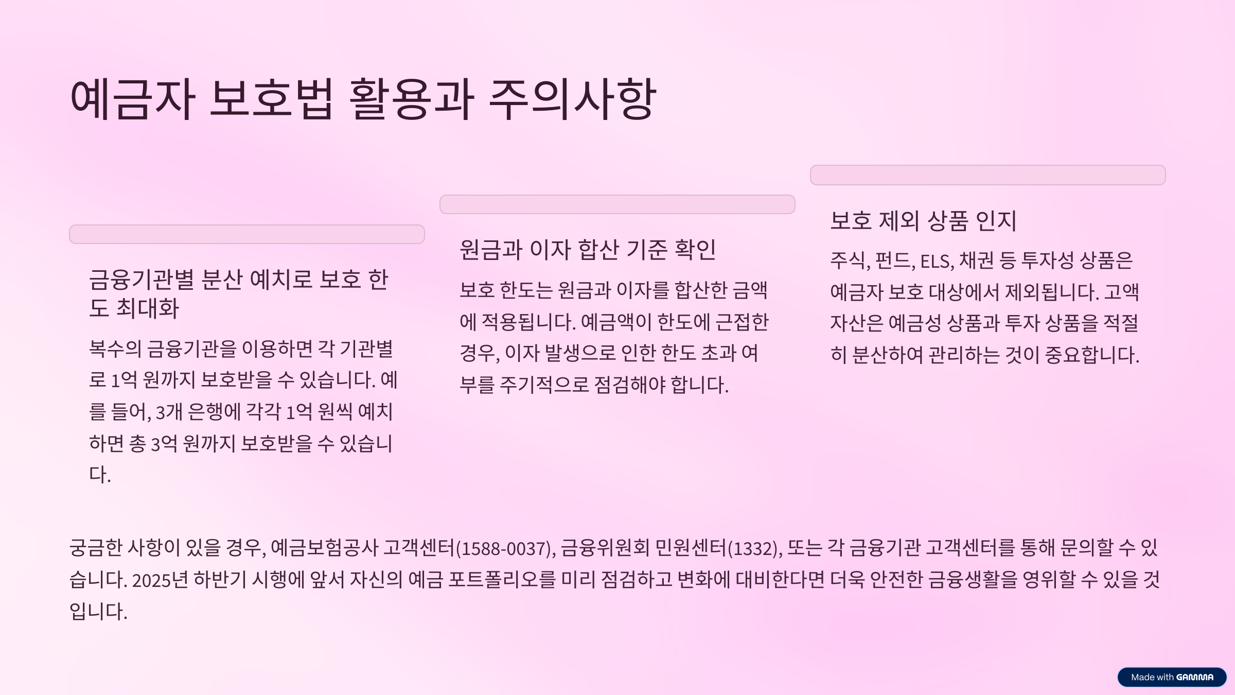 예금자 보호법 1억 시행시기는 금융시장 안정성을 높이고 금융소비자의 불안을 줄여주는 긍정적인 제도 개편으로 평가받고 있습니다. 특히 노후자산 관리, 목돈 운용, 고액자산 분산 등 실질적인 금융생활에서 적용되는 폭이 상당히 커질 전망입니다. 2025년 하반기 시행에 맞춰 자신의 예금 포트폴리오를 점검하고, 변화에 미리 대비해 두시면 더욱 안전한 금융생활을 이어가실 수 있습니다.